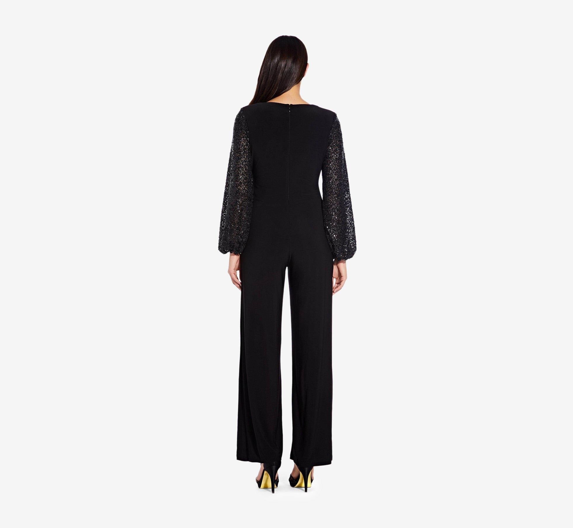 This fabulous formal jumpsuit features a v-neck surplice top, long sleeves with sequin balloons and a ruched bodice. Trousers with straight legs and a zip in the back complete the details of this attractive evening look. Perfect for any special occasion.