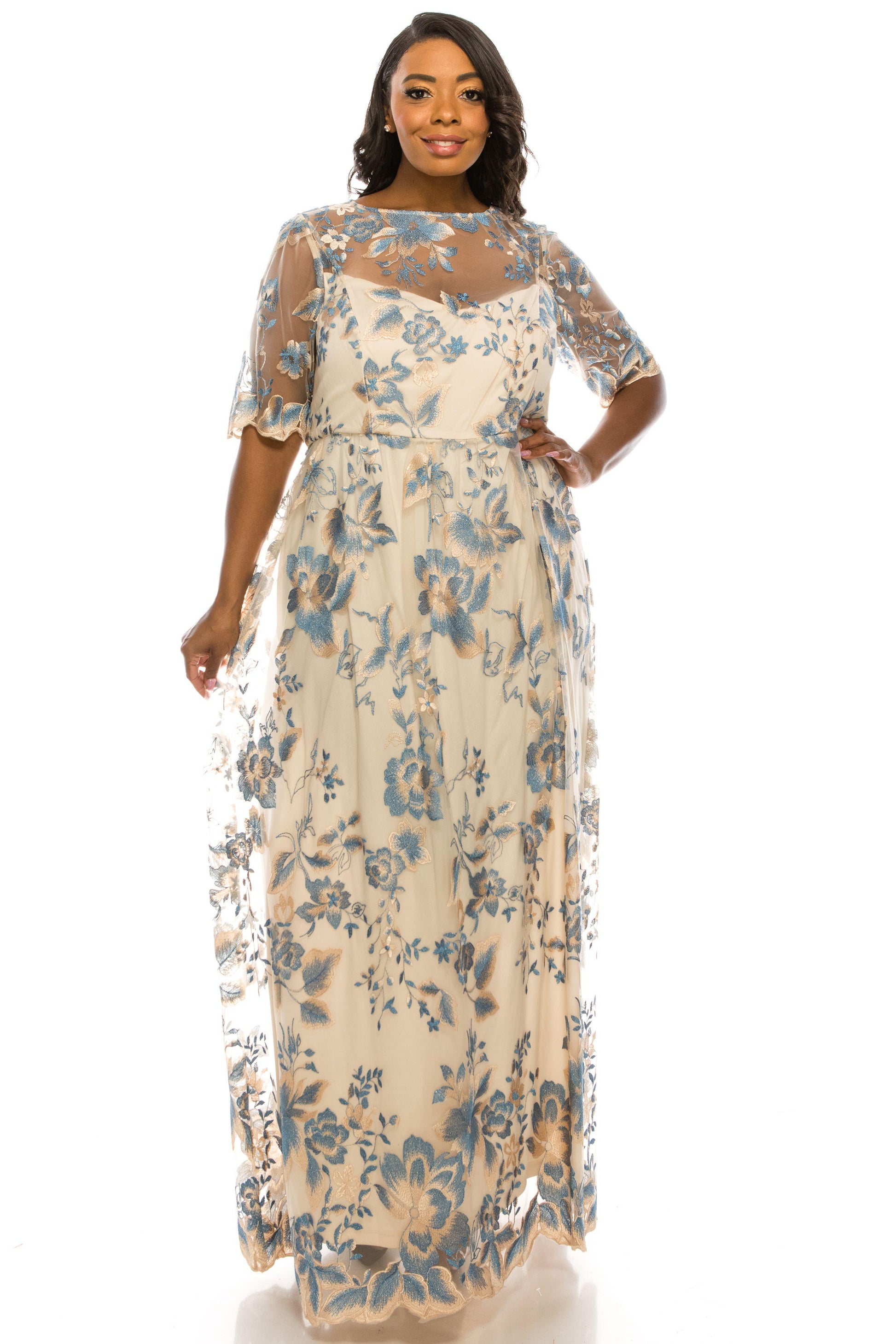 This modest mother of the bride/groom in this long gown highlights a 3/4 sleeve crew neck with blue floral embroidery on the mesh and features an illusionary bodice of bodice and embroidered petal/leaf hem. Perfect for any special occasion.