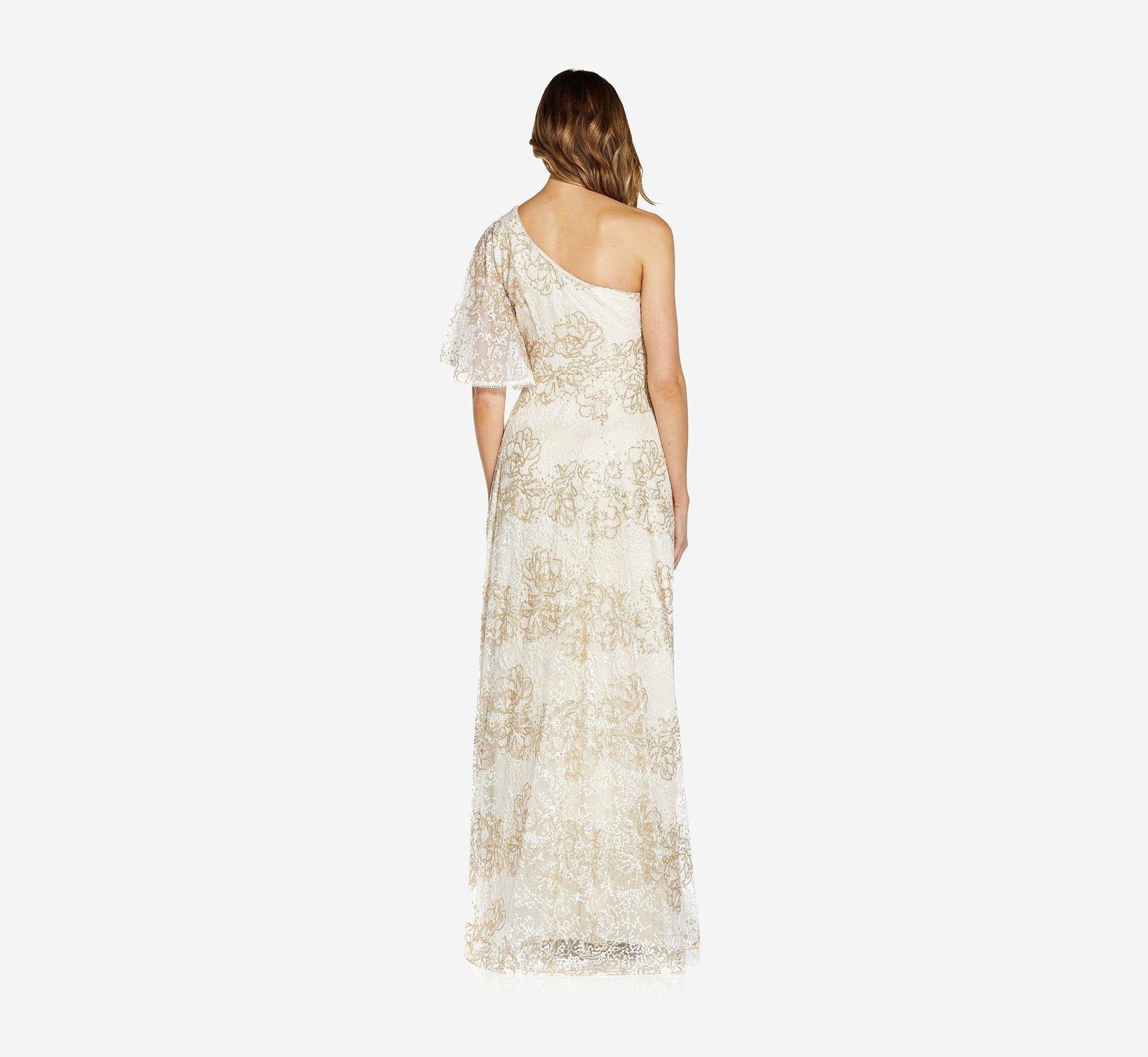 A soft flowing gown with an iconic silhouette on one shoulder accented with delicate flowers and embellished with an easy-to-move hem and is made of mesh. Perfect for any special occasion.