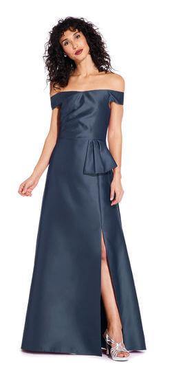 This elegant floor length dress features an off the shoulder bodice gives way to a full ball skirt.An eye-catching slit adds balance to this ultra elegant evening gown. Perfect for formal, evening party or any special occasion.