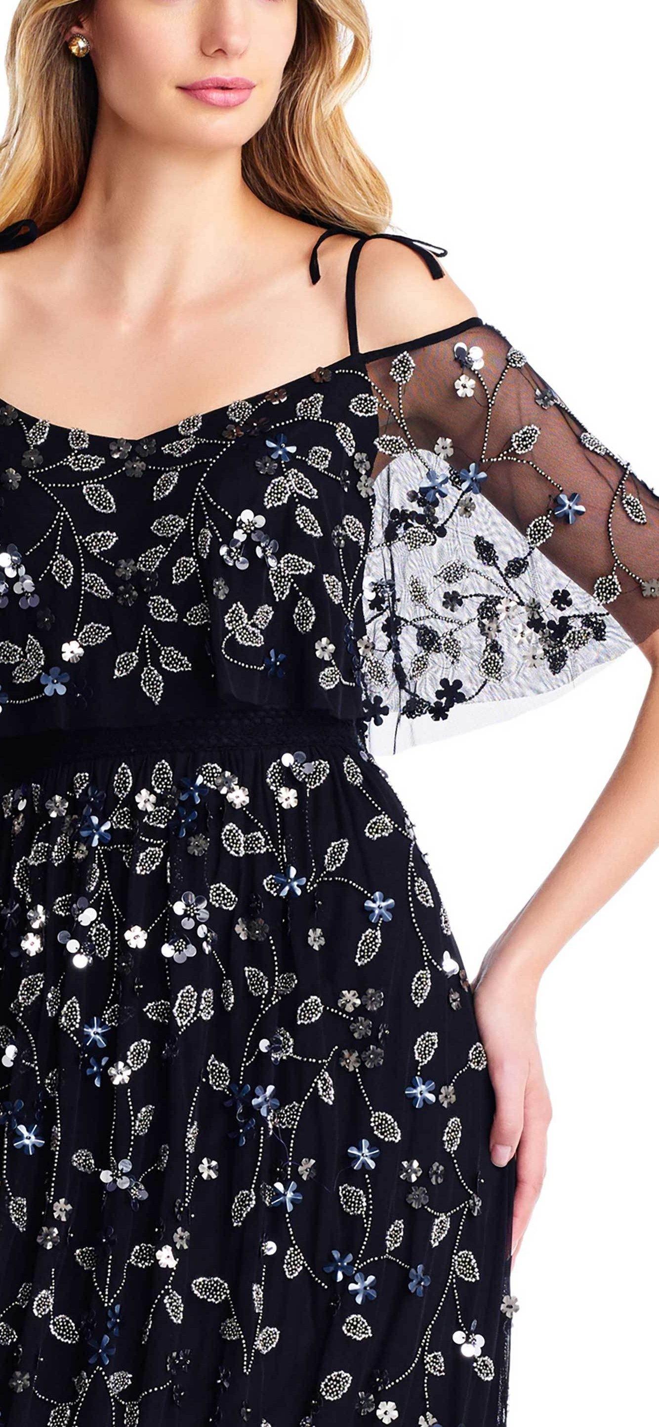 This gorgeous long dress features a fitted bodice framed with a wide V-neckline supported by spaghetti straps forming a cold shoulder sheer short sleeves. Beaded floral embellishments adorn the whole stunner as the natural waist is gathered. Popover detail adorns the skirt as it tapers a full length hemline.