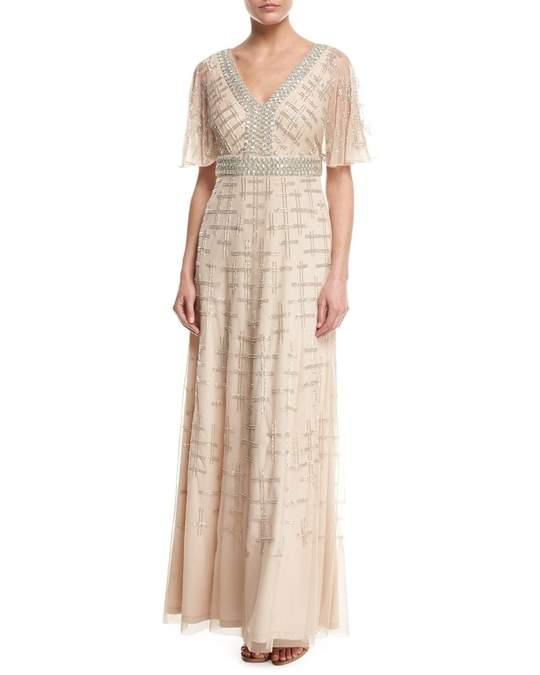 This elegant sheath long gown features a v-neckline paired with short flutter sleeves with embellished bodice. The back captivates with a keyhole cutout on it stunning capelet design. Perfect for formal, evening party or any special occasion.