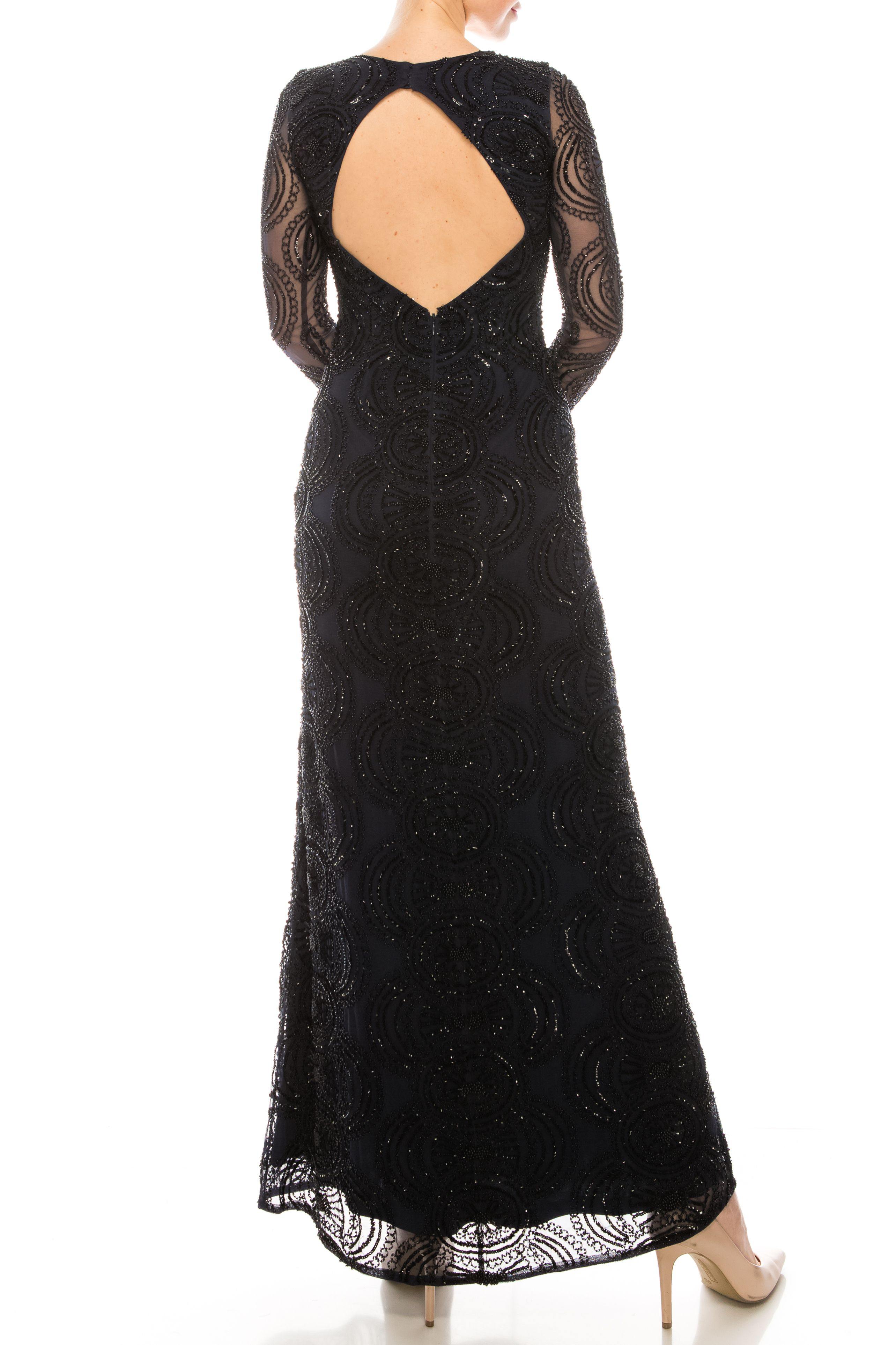 This beautiful long dress for the mother of the bride features illusion crew-neck with long sleeves with back cutout and is made of beaded mesh. Perfect for any special occasion.