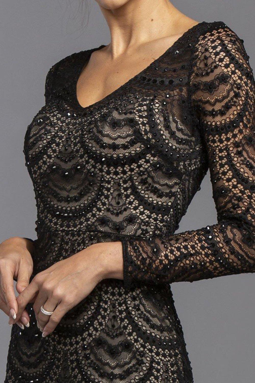 This gorgeous long dress features a long sleeve scoop neckline. Fitted mermaid style patterned dress. This dress is perfect for any special occasion.