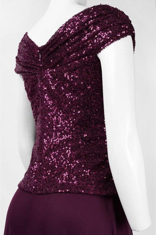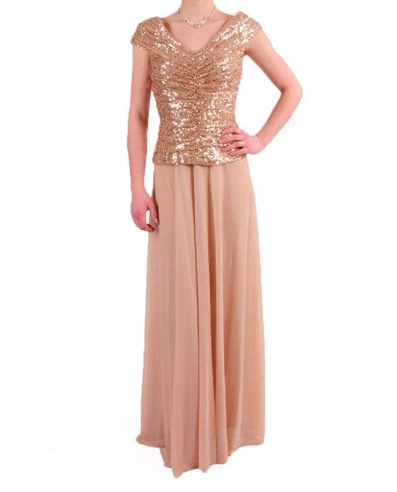 This dazzling A-line floor length dress features cap sleeve with v-neckline. This dress comes with a v-cut back, mocked two piece dress with mesh and sequins bodice material. Perfect for formal, evening party and other special occasion