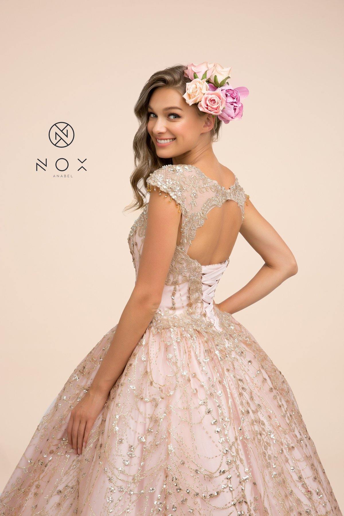 This stunning long dress features a cap sleeve glitter ball gown embroidered with beaded lace appliques. Embellished open back with keyhole cutout. Floor length A-line skirt with small train. This dress is perfect for any special occasion.