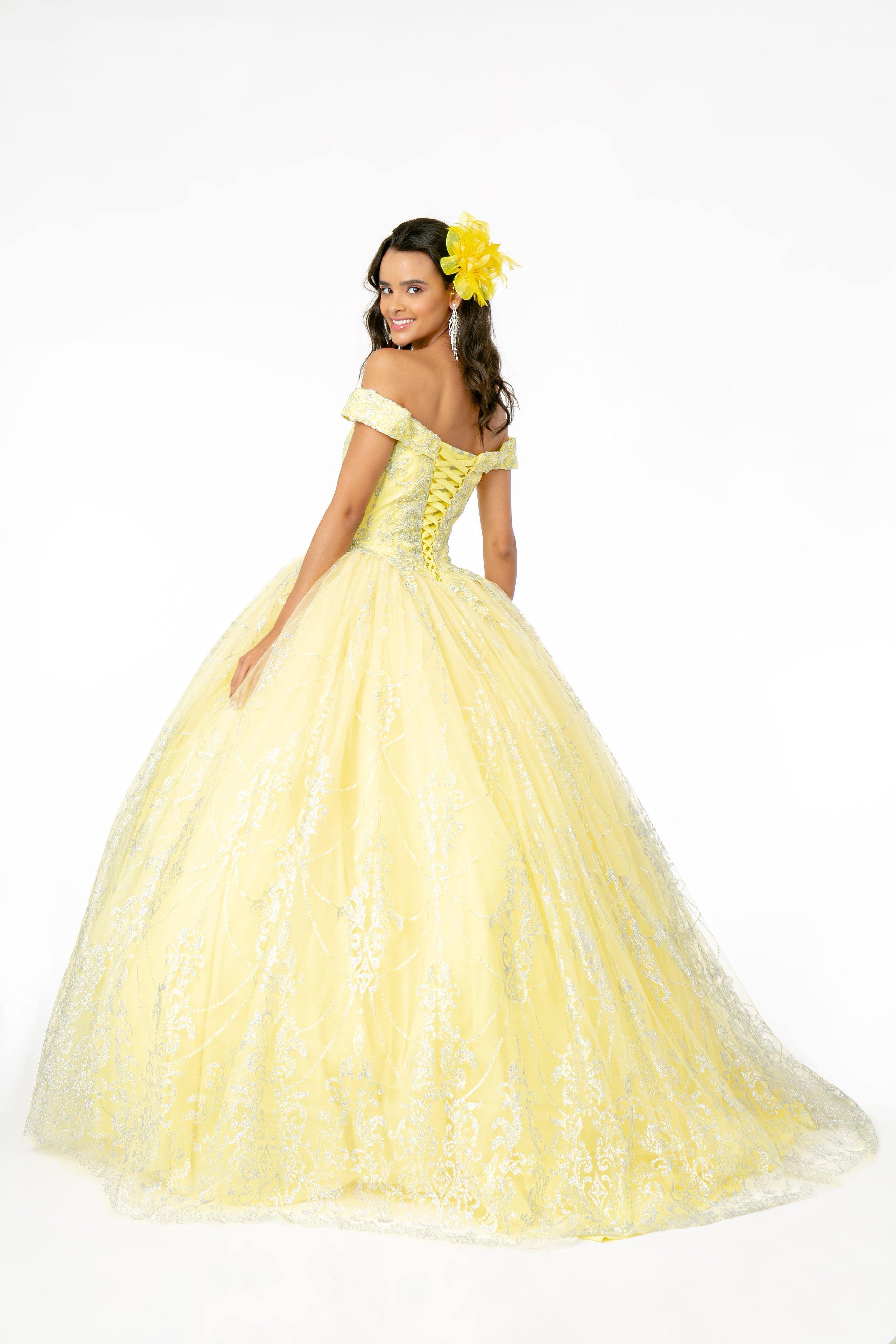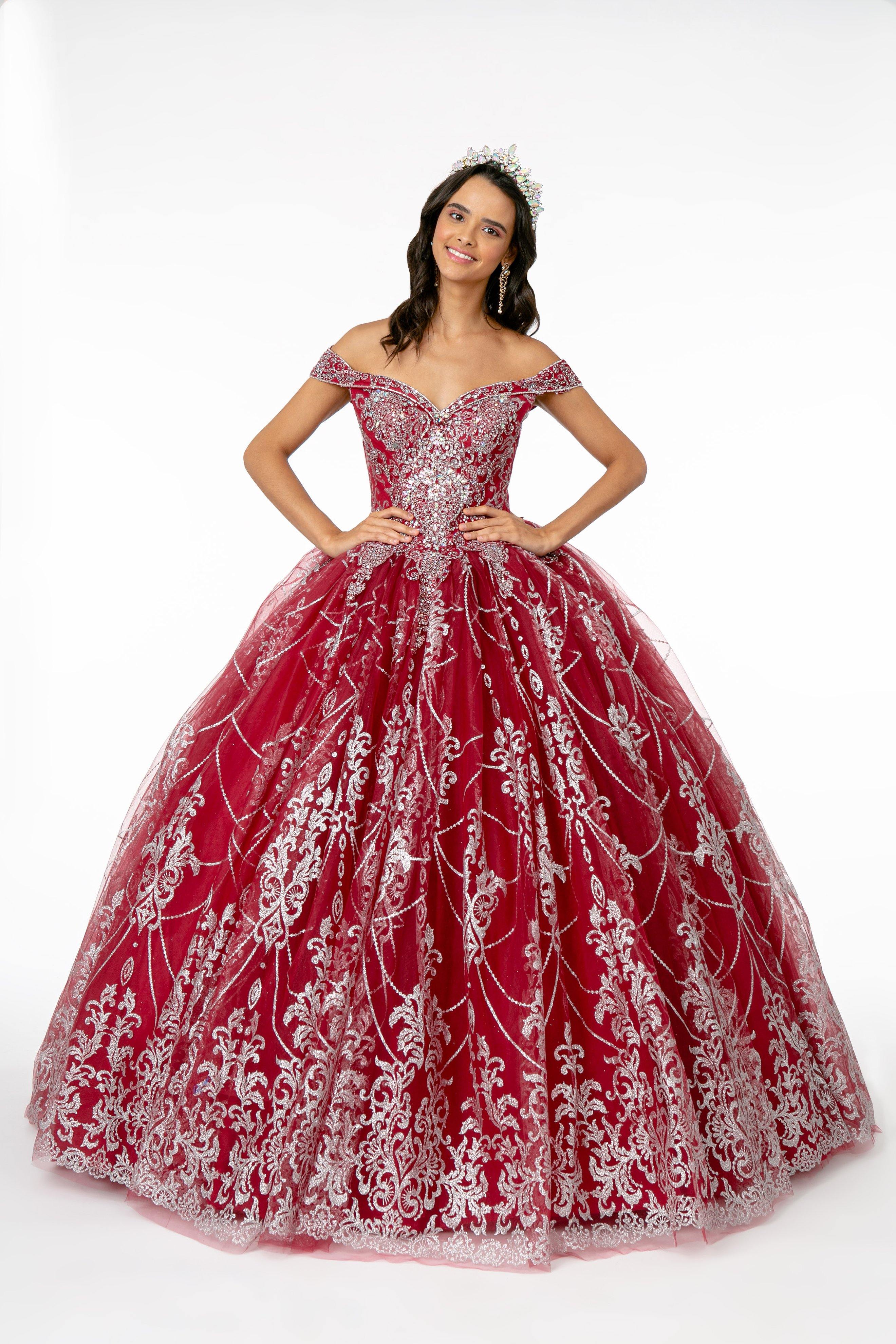 Indulge in the exquisite beauty of this stunning floor-length gown, showcasing an elegant off-shoulder sweetheart neckline. The A-line silhouette is accentuated by a dazzling, embellished glittered bodice, making it the epitome of elegance. Whether it's a sweet 16 celebration, a debut, or any special event, this dress is the ideal choice for making a lasting impression.