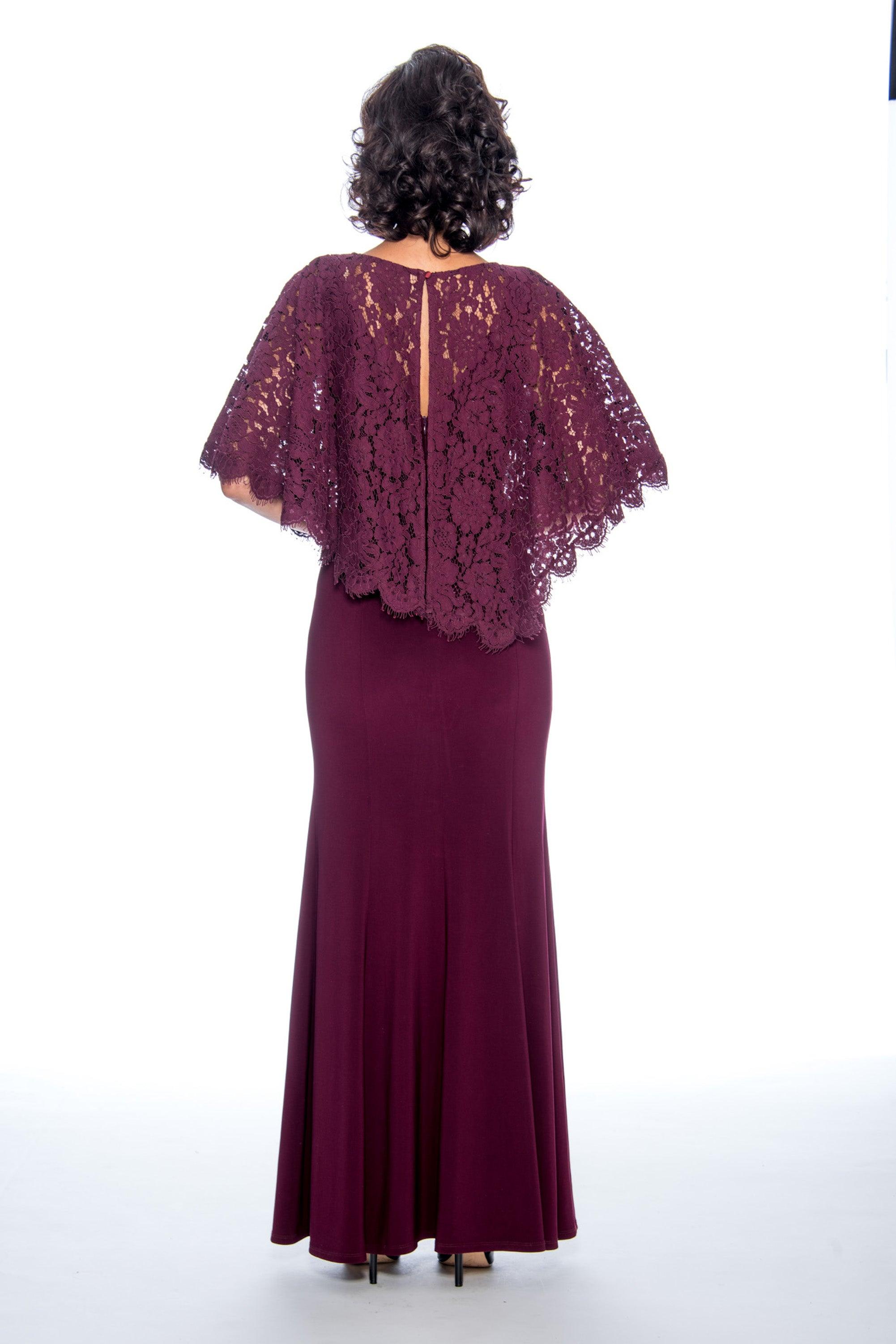 This elegant long dress features a lovely V-neck dress in heavily seam lined jersey fabric, a comfortable material that stays incredibly good and falls well with the weight. The dress features classy Lace Cape top adding a dramatic covering to the sleeveless bodice. Fitted through the hips, the skirt flares with mermaid finish at floor length.