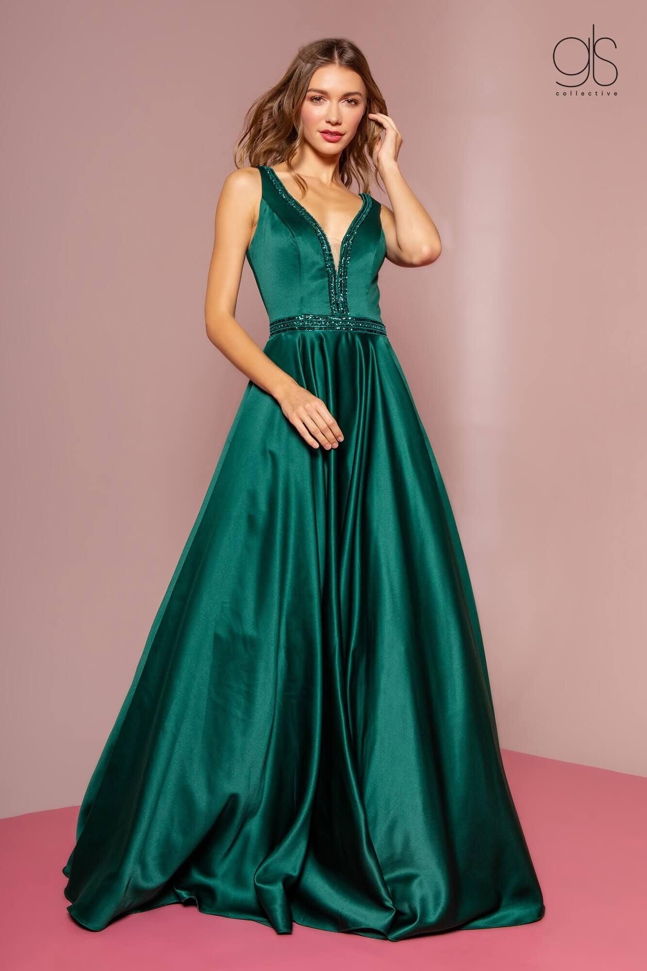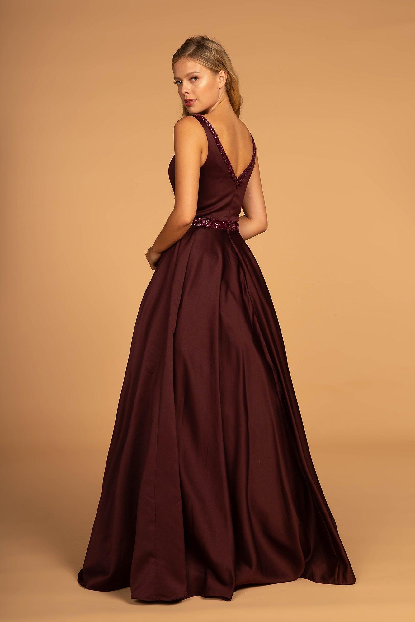 This elegant a line floor length dress features a sleeveless illusion deep V neckline bodice with a sheer inset panel for coverage and support, beaded accents for a touch of sparkle, v back design and made of satin material. Perfect for prom, homecoming, formal or any special occasion.