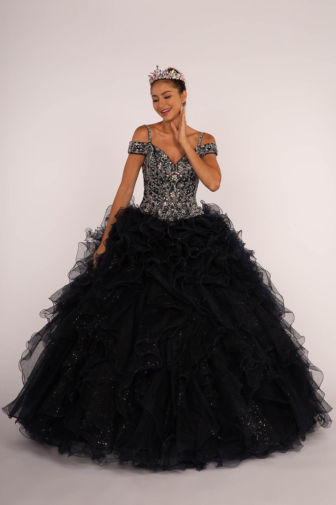 This elegant floor length dress features beaded off shoulder with v neckline, low back, ruffled skirt and made of tulle material. Perfect for quinceanera, sweet 16, debut or any special occasion or any special occasion.