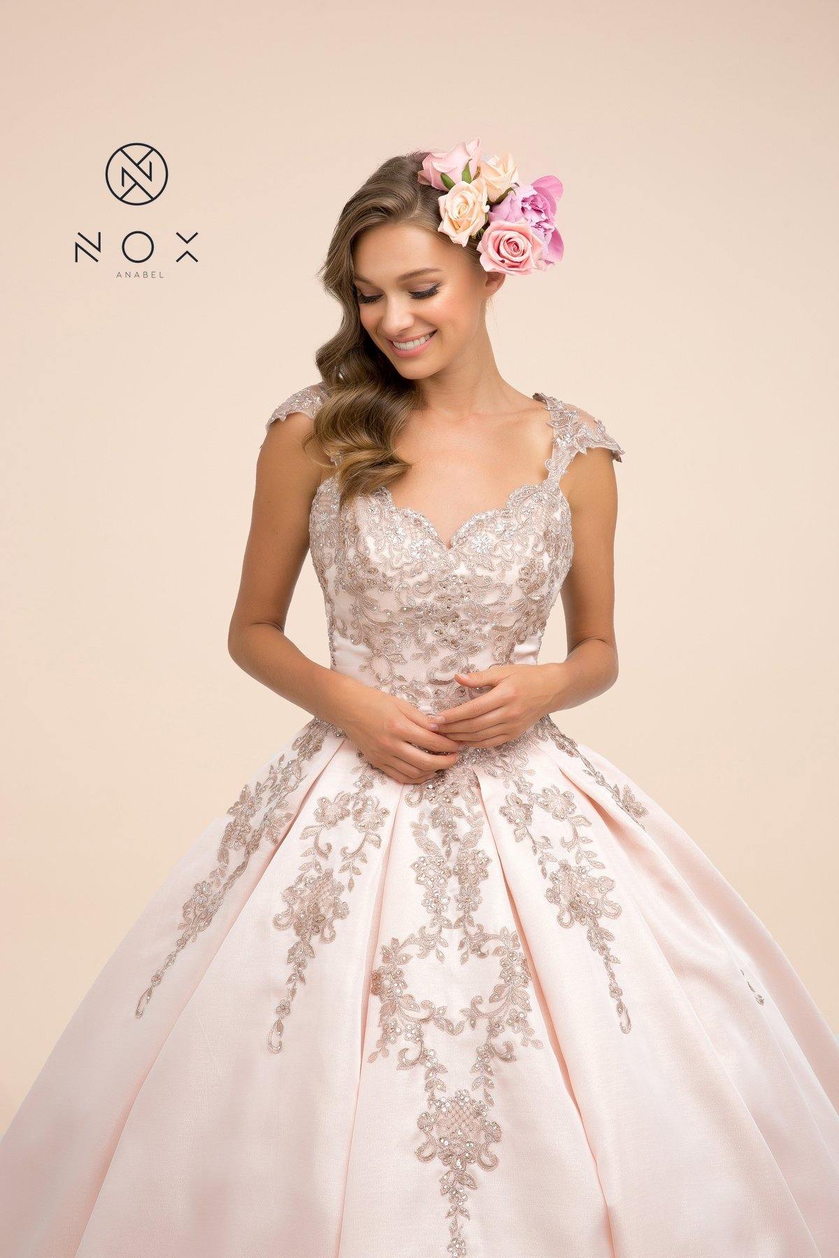 This stunning long dress features a cap sleeve satin ball gown embroidered with beaded lace appliques. Embellished open back with keyhole cutout and a lace up corset back. This dress is perfect for any special occasion.