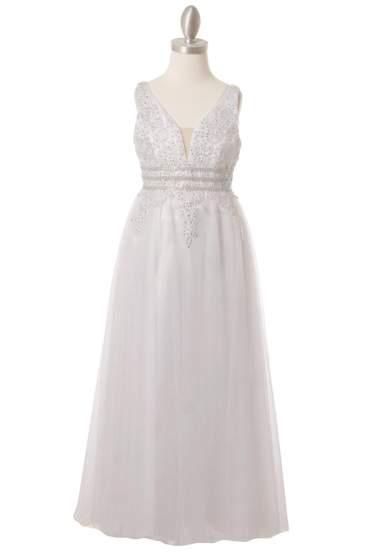 This simply elegant flower girl dress features a sleeveless V-neckline. The bodice is decorated with lace appliques. Multi layered skirt perfect for any special occasion.
