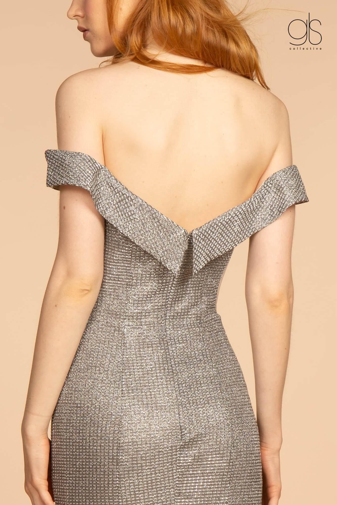 This stunning mermaid style floor length dress features off the shoulder with open back and made of glitter crepe. Perfect for formal, evening party or any special occasion.