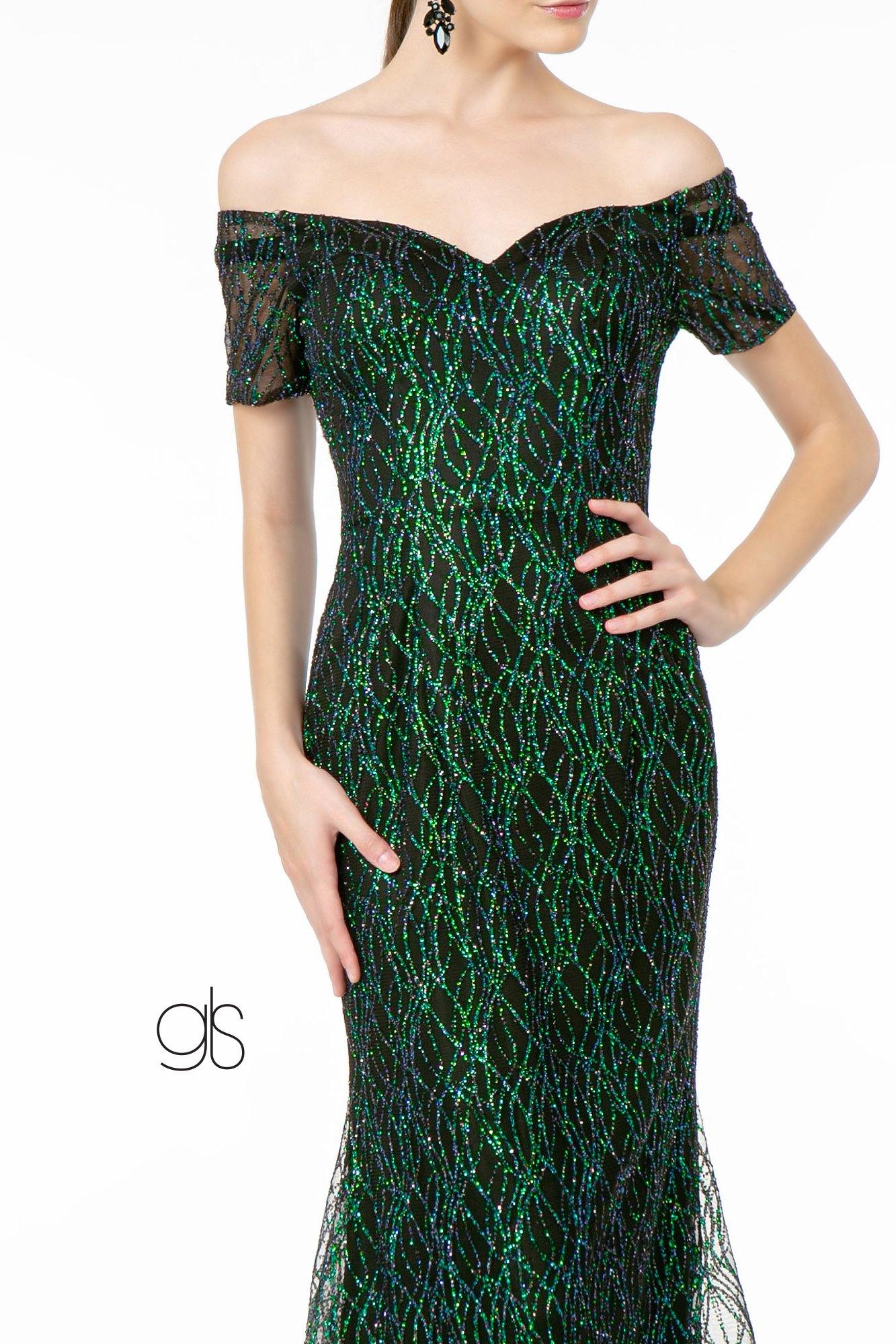 This stunning gorgeous long prom dress features an off shoulder sweetheart neckline. Floor length mermaid skirt with floral glitter design. This dress is perfect for any special occasion.