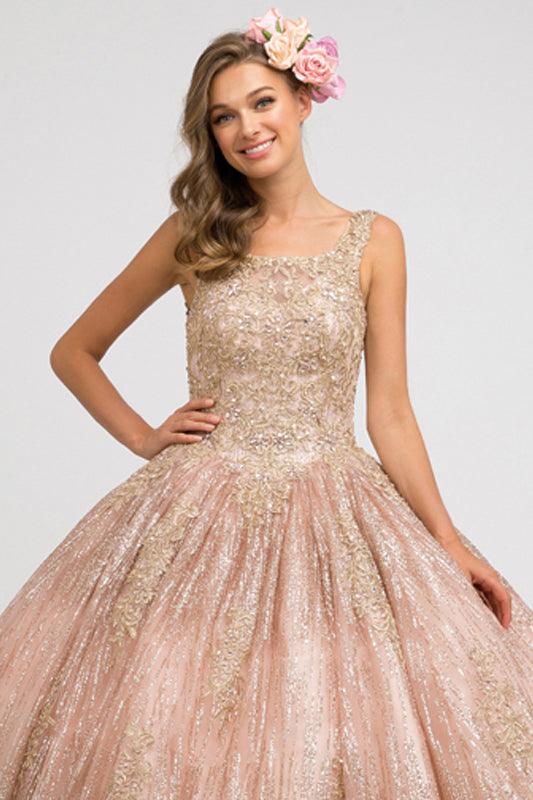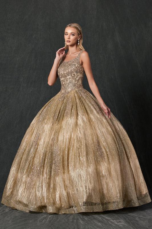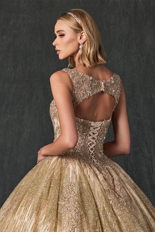 Elegant floor length dress features an off the shoulderwith open corset back. The bodice is decorated with lace appliques and embellished rhinestones. Perfect for quinceanera, ball gown or any special occasion.
