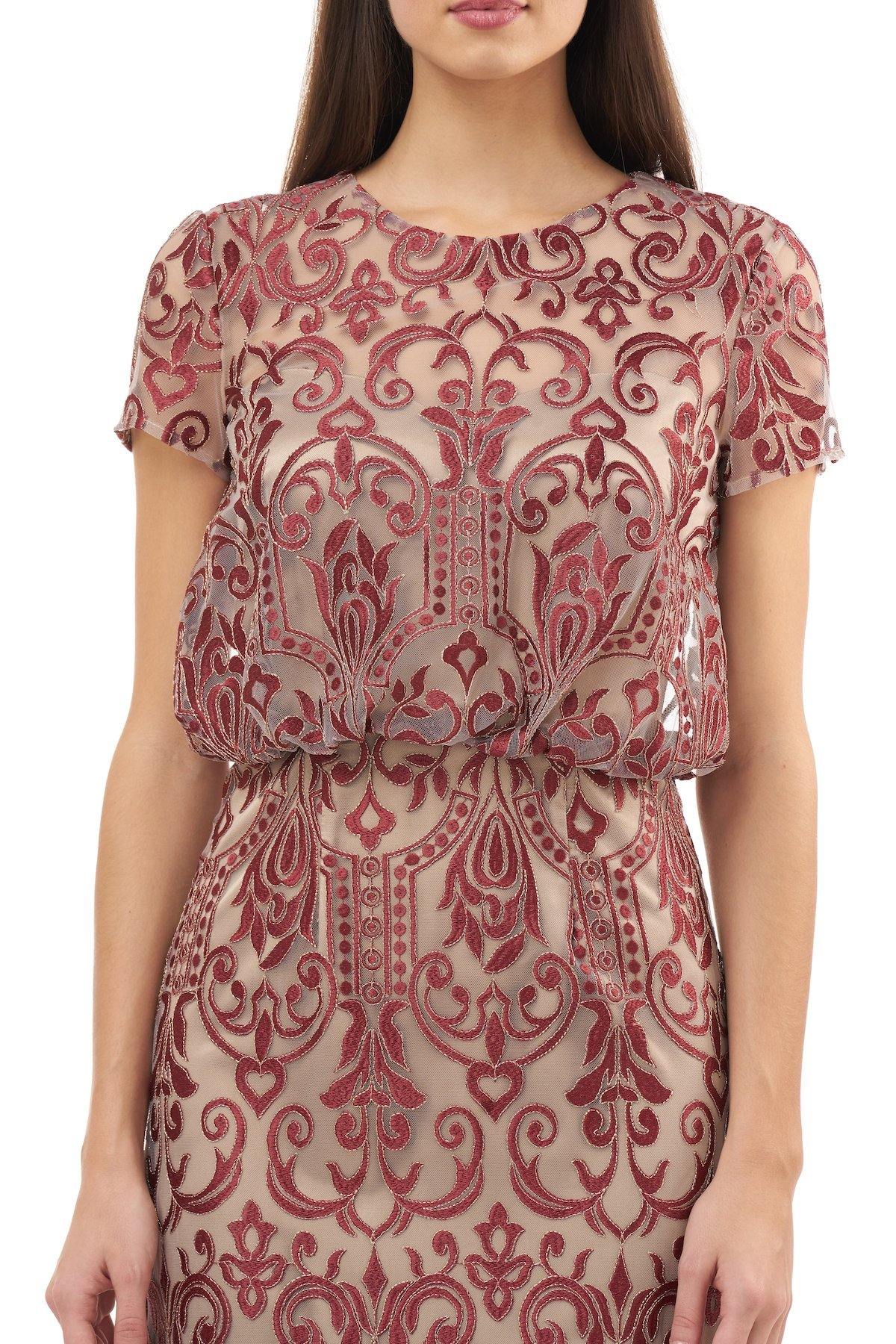 This beautiful mother of the bride embroidered dress features a neckline with precious stones and short sleeves. It has a blouson bodice and from the waist flourishes a full length sheath skirt. Perfect for any special occasion.
