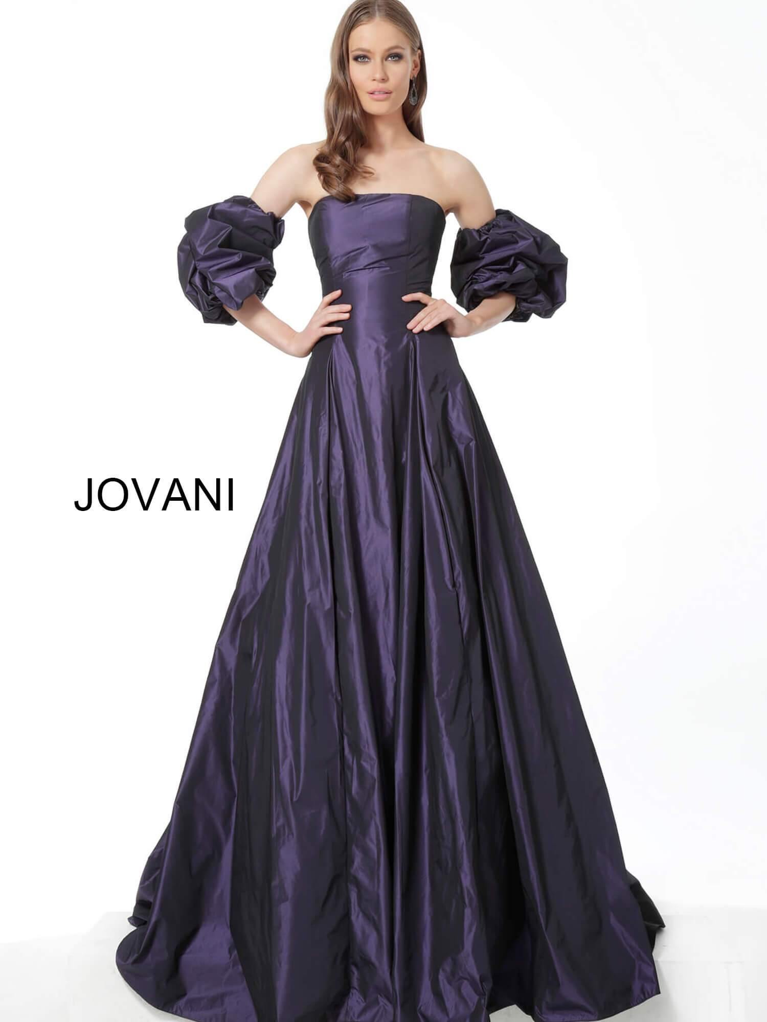 This gorgeous long dress featuring a strapless straight neckline and detached bubble sleeves. A-line silhouette in taffeta, with a tapered midriff gives way to the inverse-pleated skirt, ending in a sweep train. This dress is perfect for formal, evening party or any special occasion.