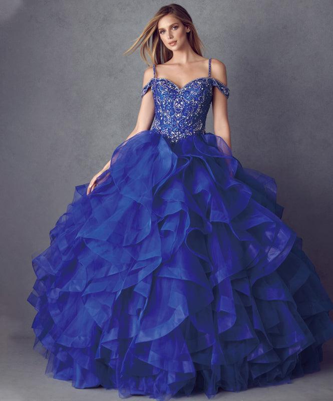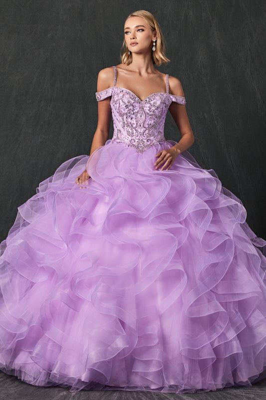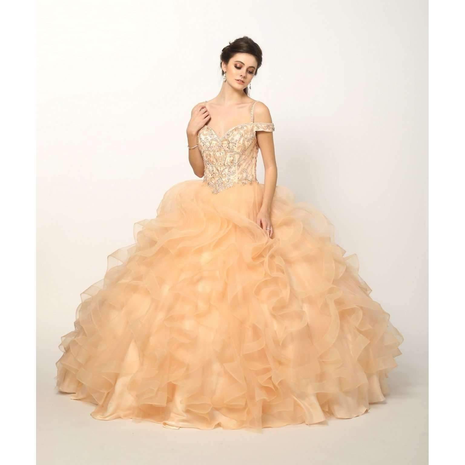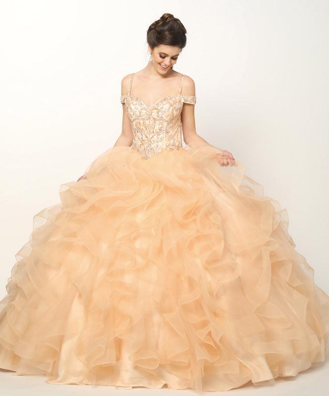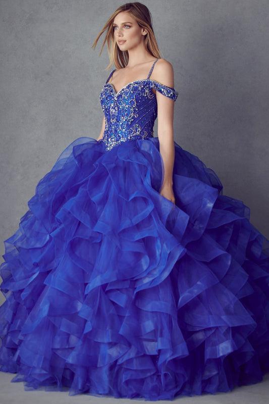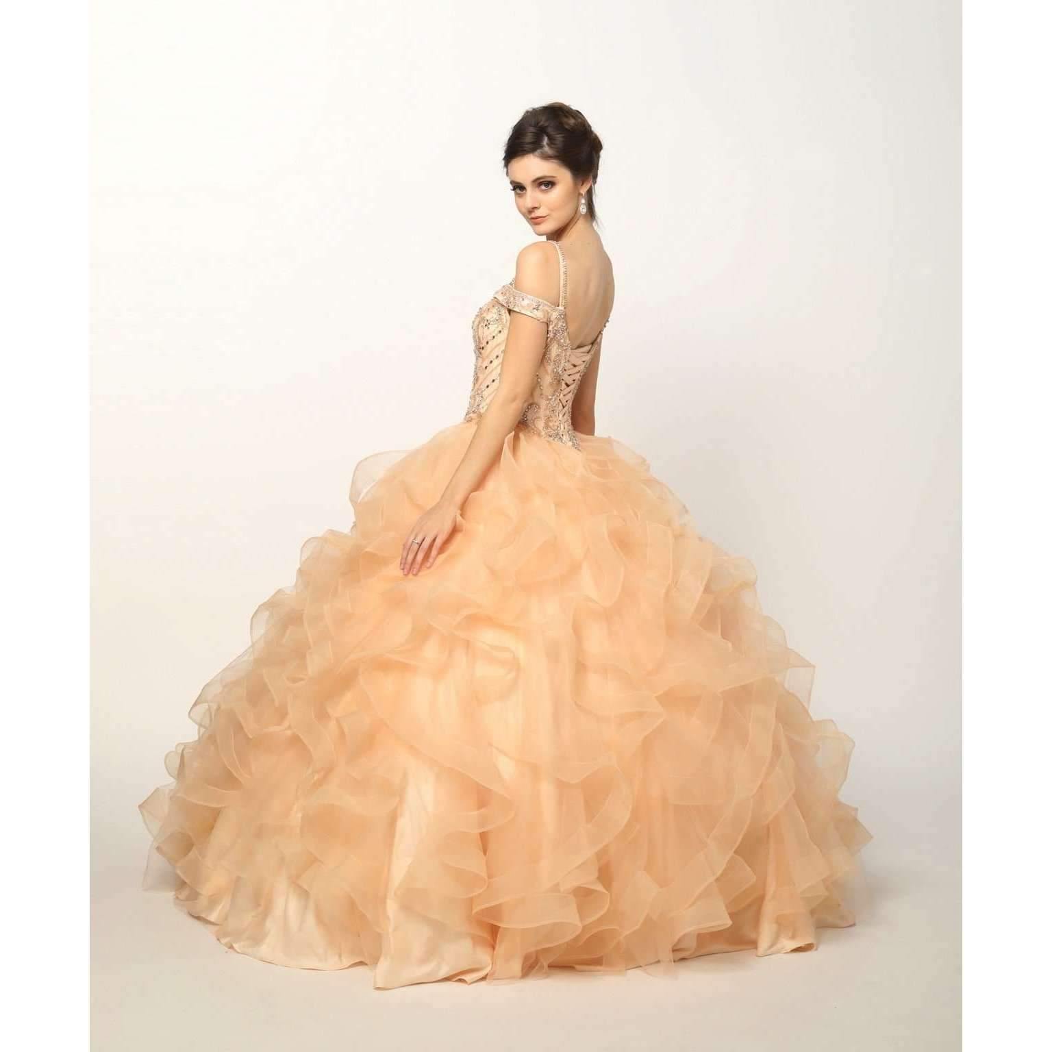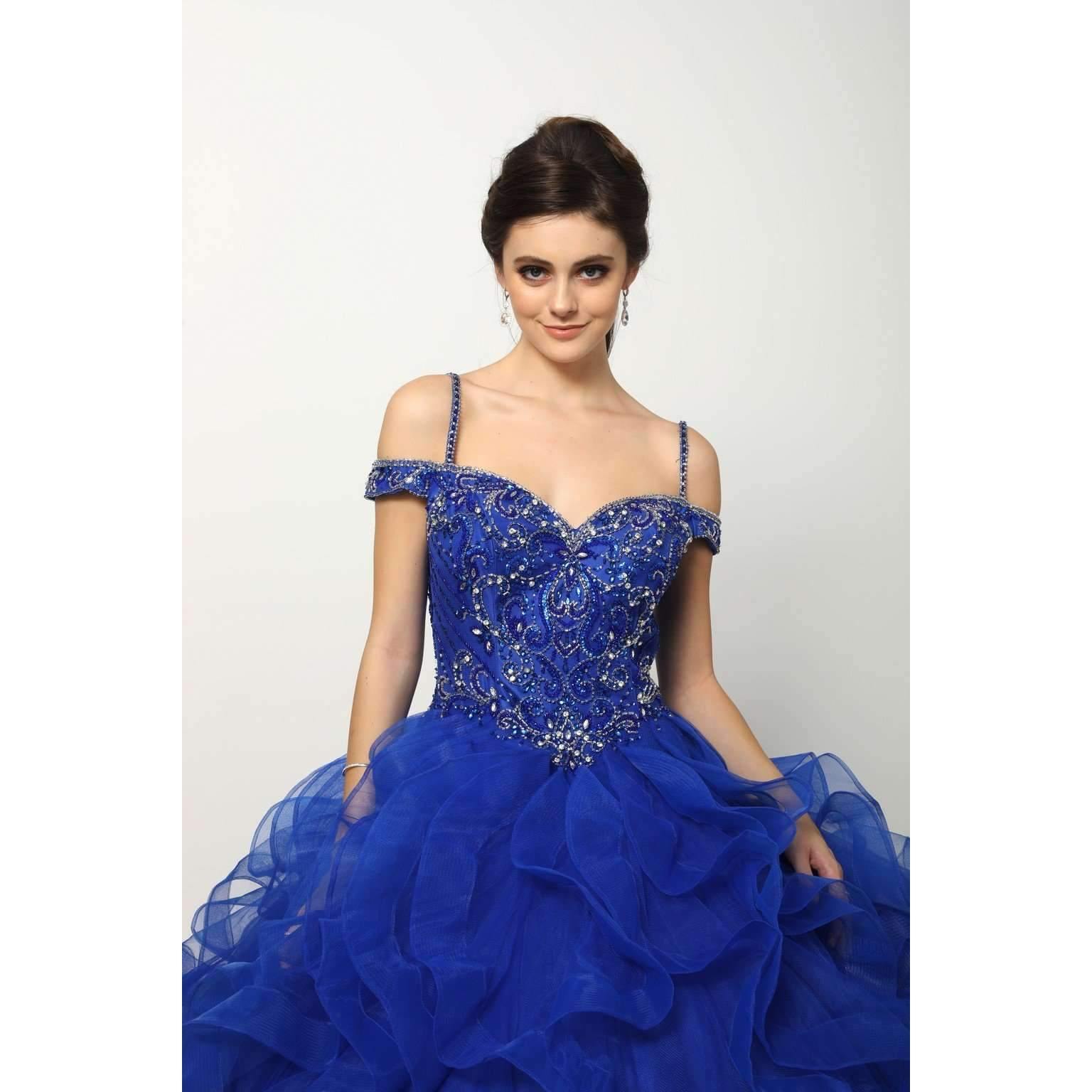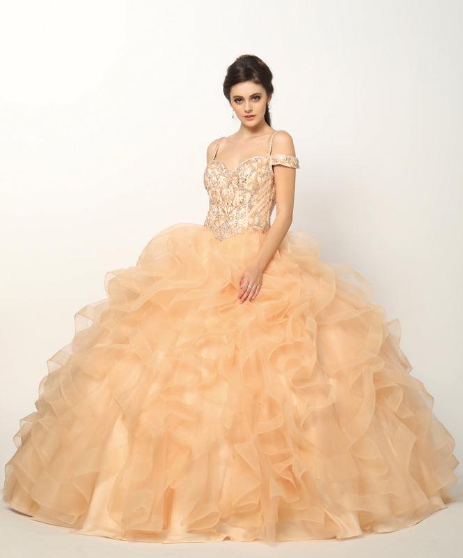 This elegant floor length ball gown features an off shoulder with intricate bodice accented with crystal beading. Long skirt with ruffles, horsehair hemline and a sweep train. Perfect for quinceanera, ball gown or any special occasion.