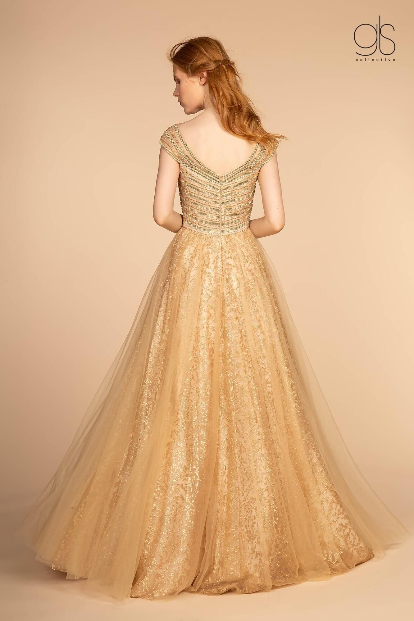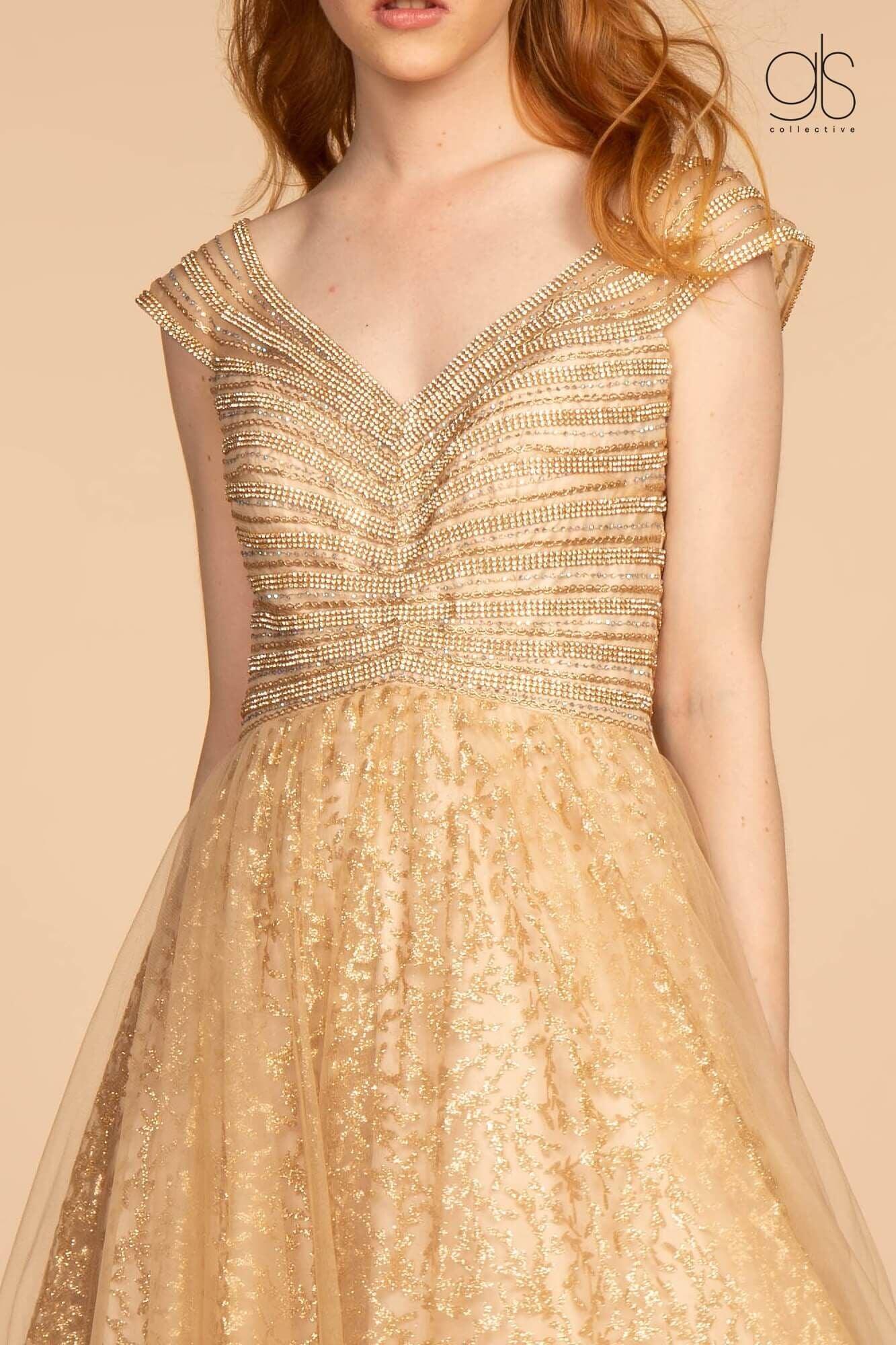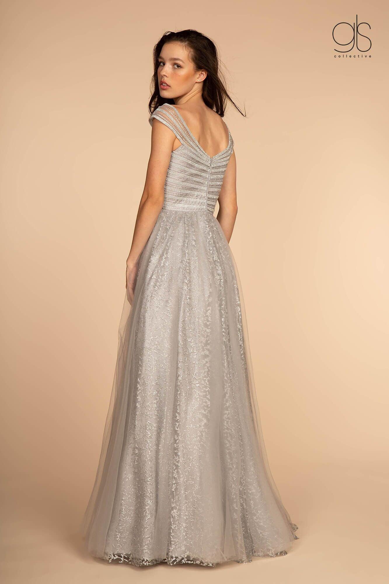 This stunning floor length dress featuring a cap sleeve v-neckline and v-back design with jewel embellished bodice and made of glitter print skirt  material. Perfect for evening party, formal or any special occasion.