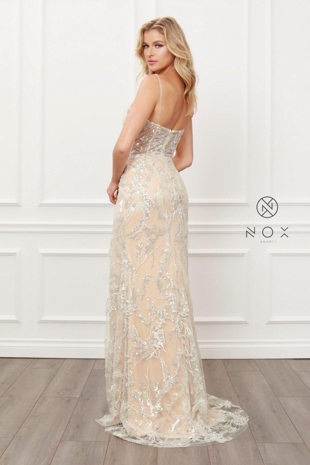This elegant long dress features a thin straps with plunge v neckline. Long mermaid gown with laced plunge v skinny neckline. This dress is perfect for any special occasion.