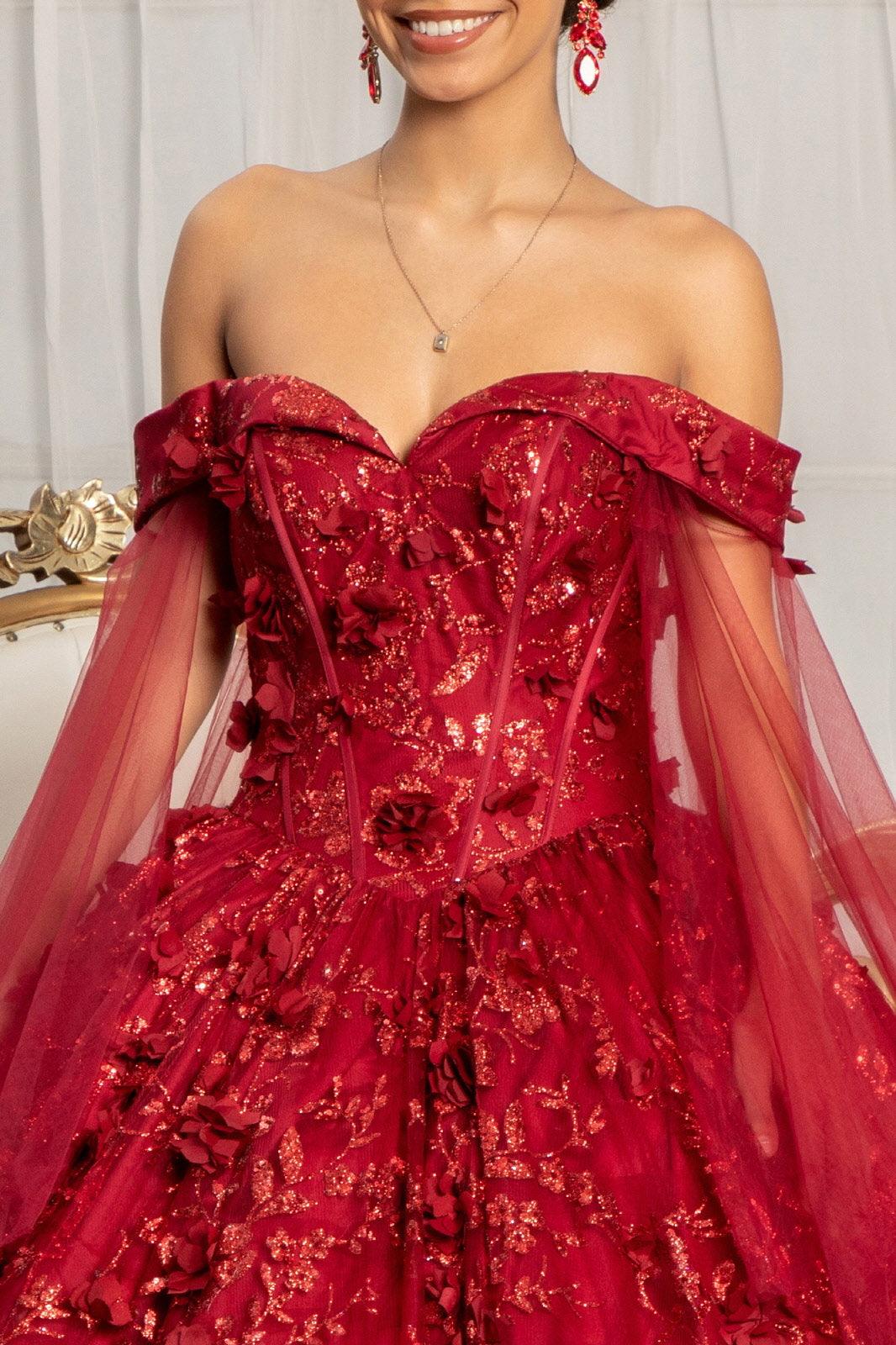 Long Off Shoulder Quinceanera Glitter Mesh Dress