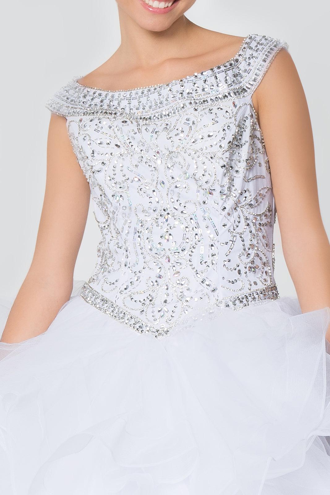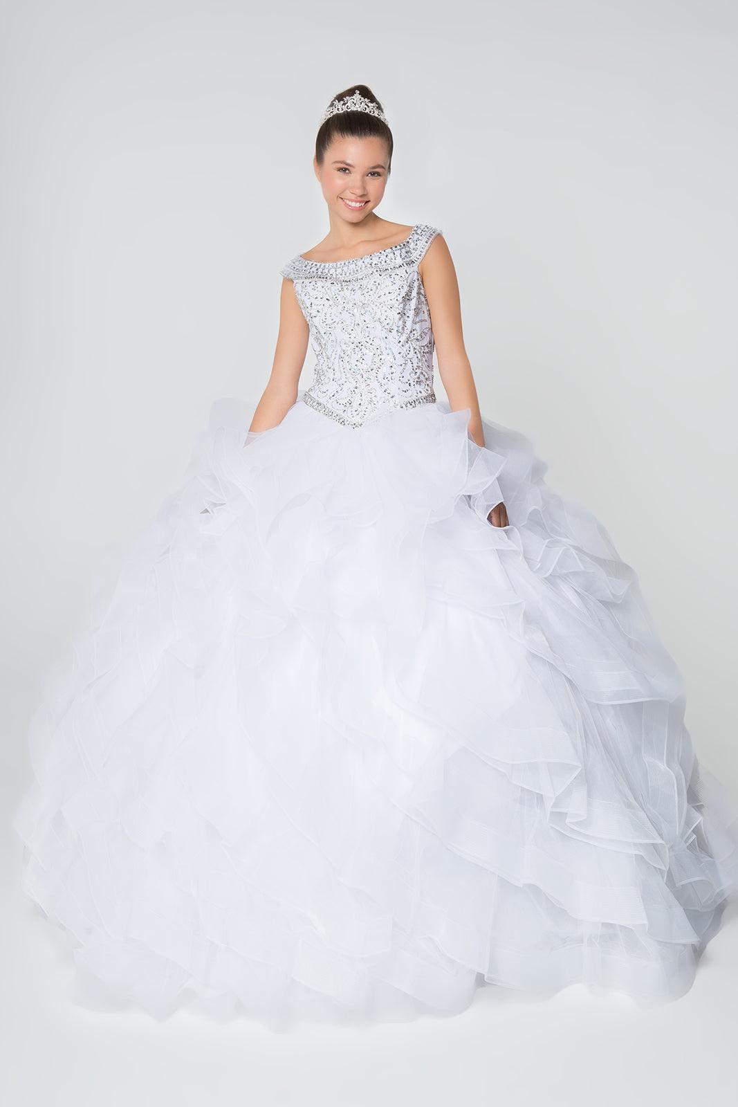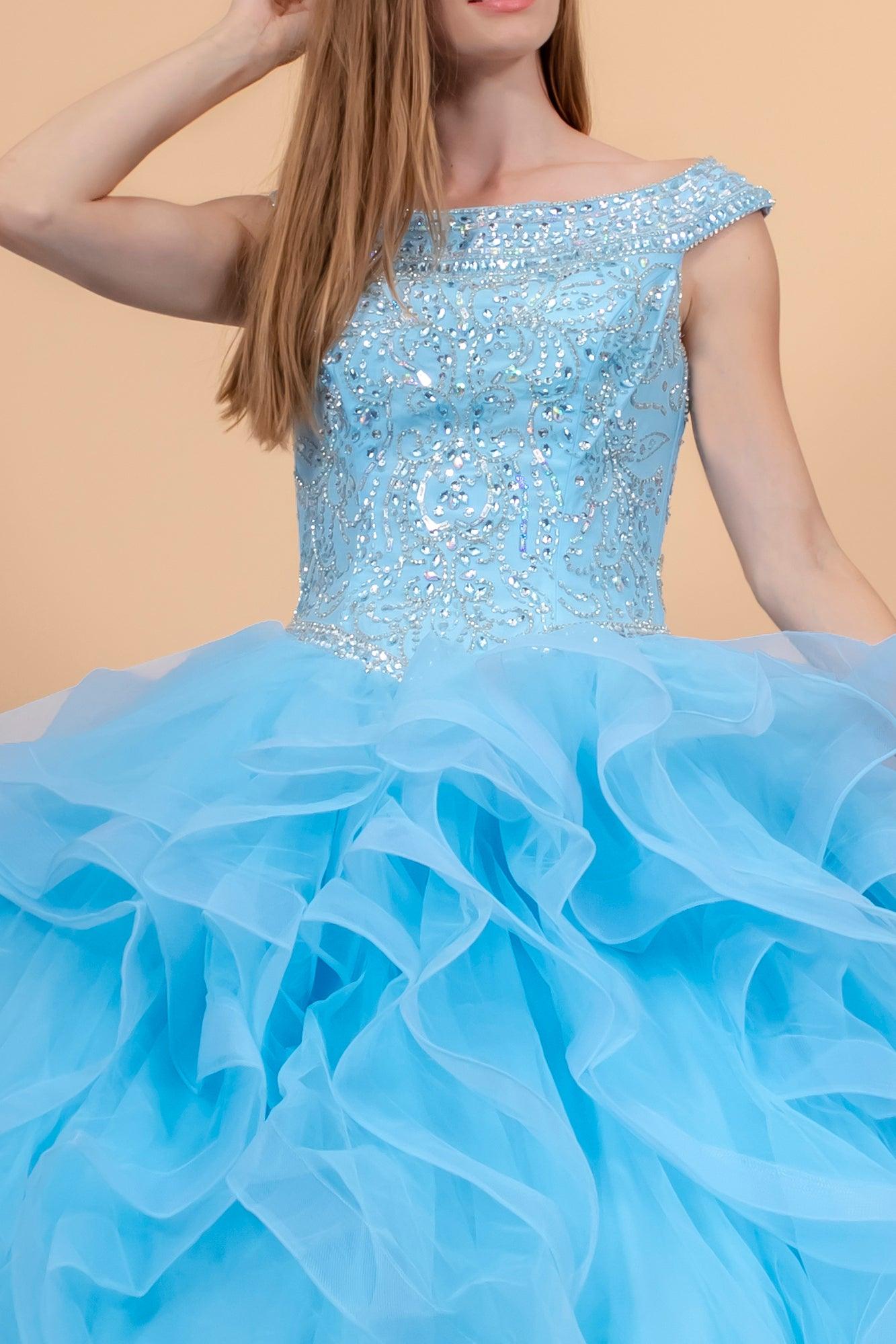 This gorgeous dress features a fitted bodice adorned with sparkling bead embellishments framed with an illusion halter neckline complemented with a mid-open back. The ballgown skirt adorns glitter pattern and embroidered lace appliques which makes a bold statement as the gorgeous sweep train adds the dramatic finish. Perfect for quinceanera, sweet 16, debut or any special occasion or any special occasion.