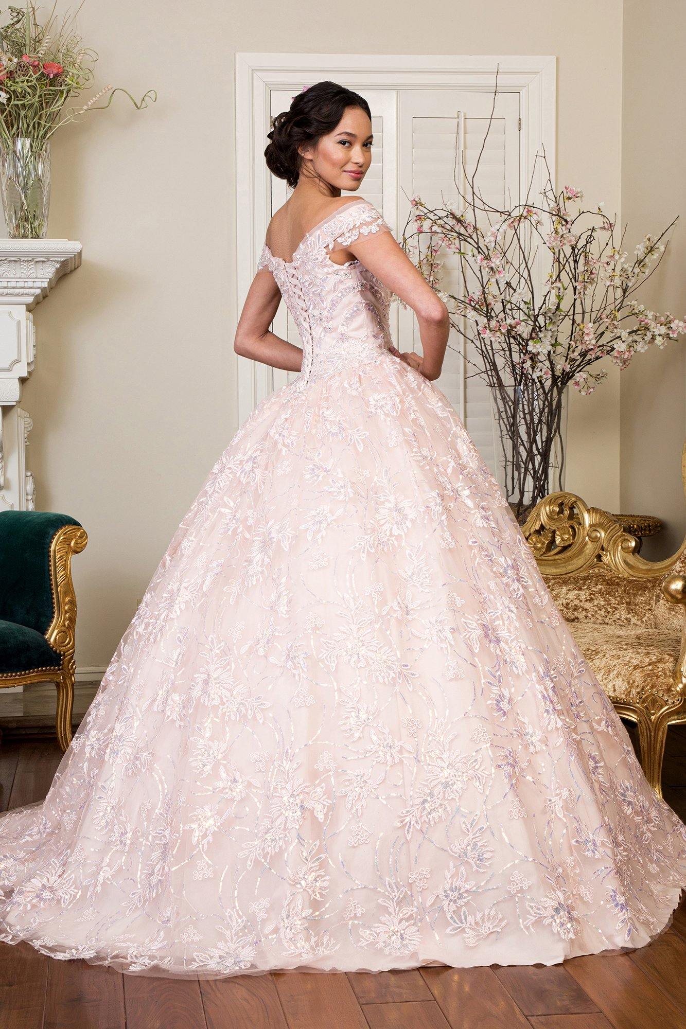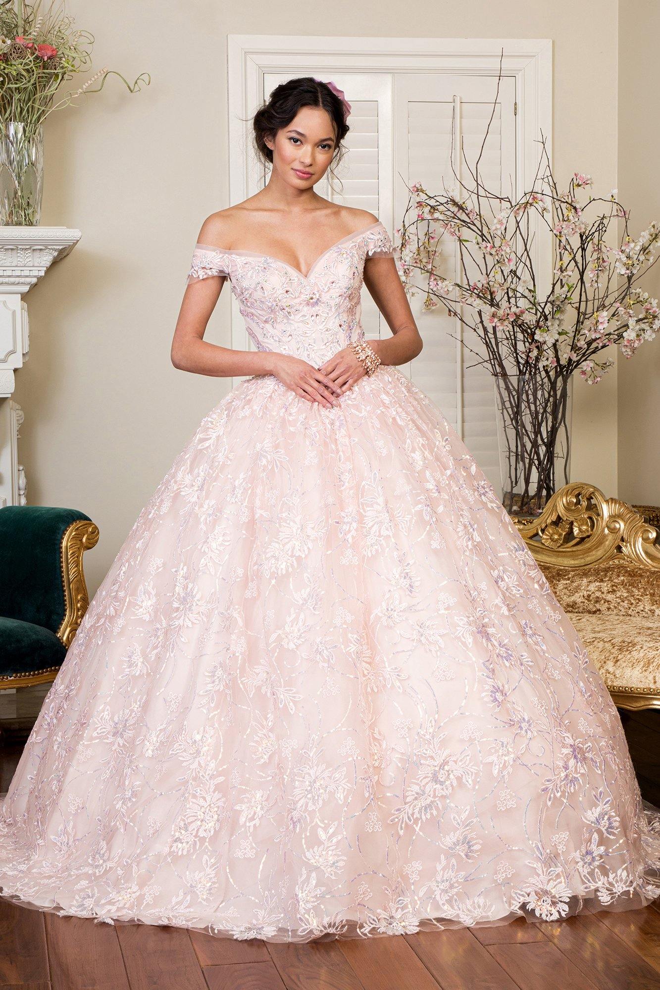 This stunning quinceanera long dress features an off shoulder sweetheart neckline with embroidery and bead appliques. It also uses sequins for shine and closes with a back tie with a sweep train finish. Perfect for quinceanera, sweet 16, debut or any special occasion