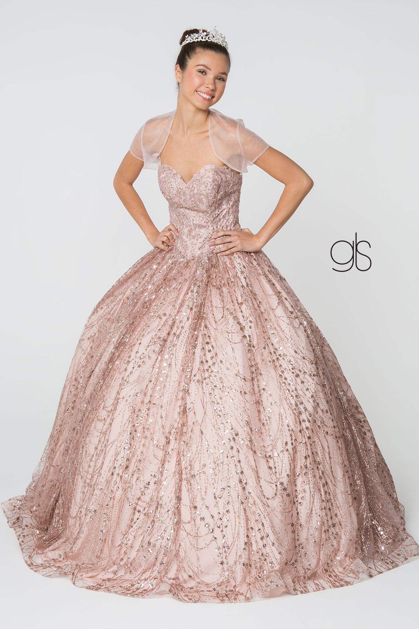 This charming dress shines with strapless, cute neckline and corset bodice. An open skirt in a volumetric silhouette. The dress is complemented by a matching mesh bolero. Perfect for quinceanera, debut, sweet 16, ball gown or any special occasion.