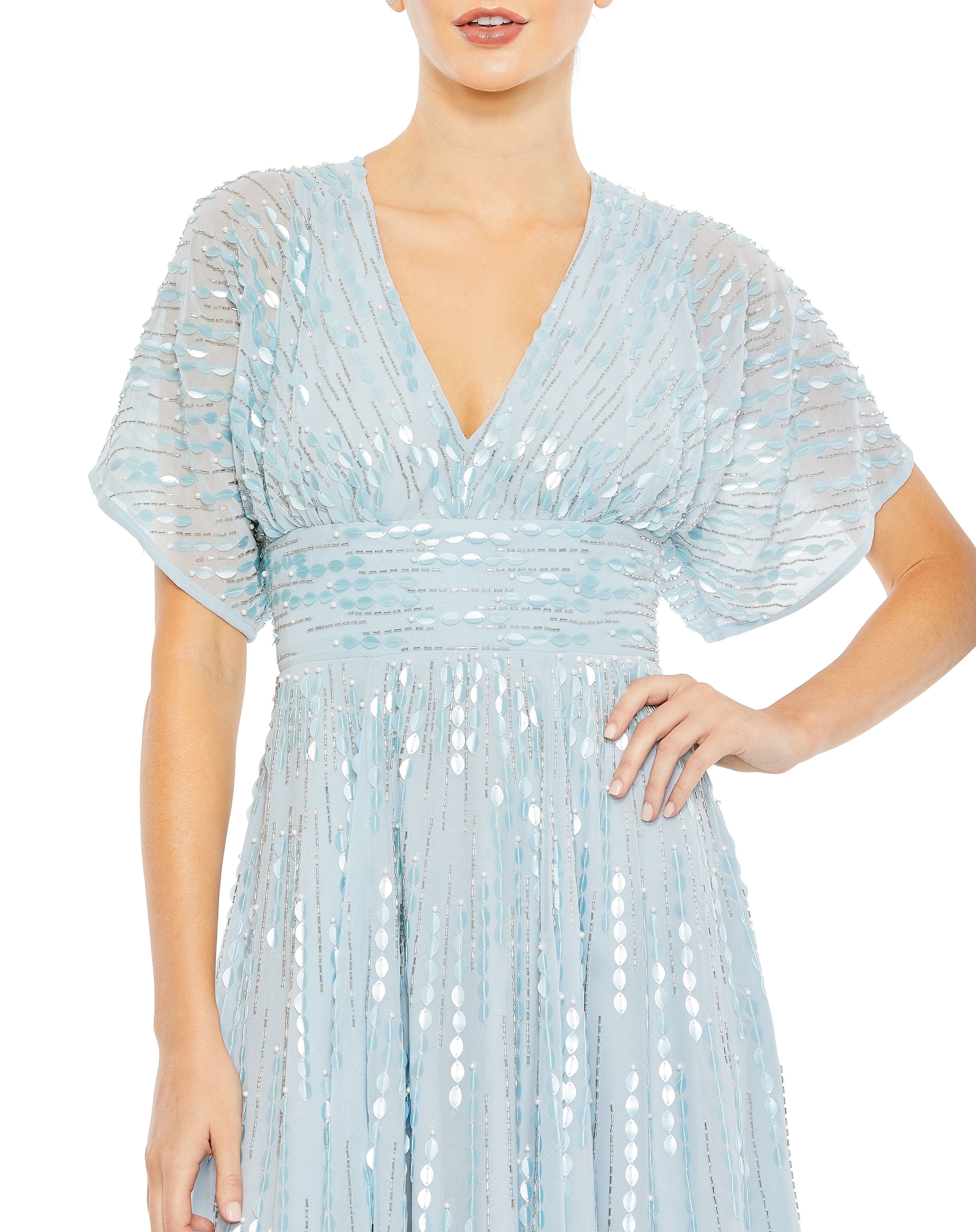 Command attention in Mac Duggal 10807. Adorned with sequins in a linear pattern, this gown radiates charm. The V-neck, short sleeves, and A-line skirt create a fabulous look. The full-back zipper ensures easy wear for a stunning floor-length silhouette. Get ready to shine!