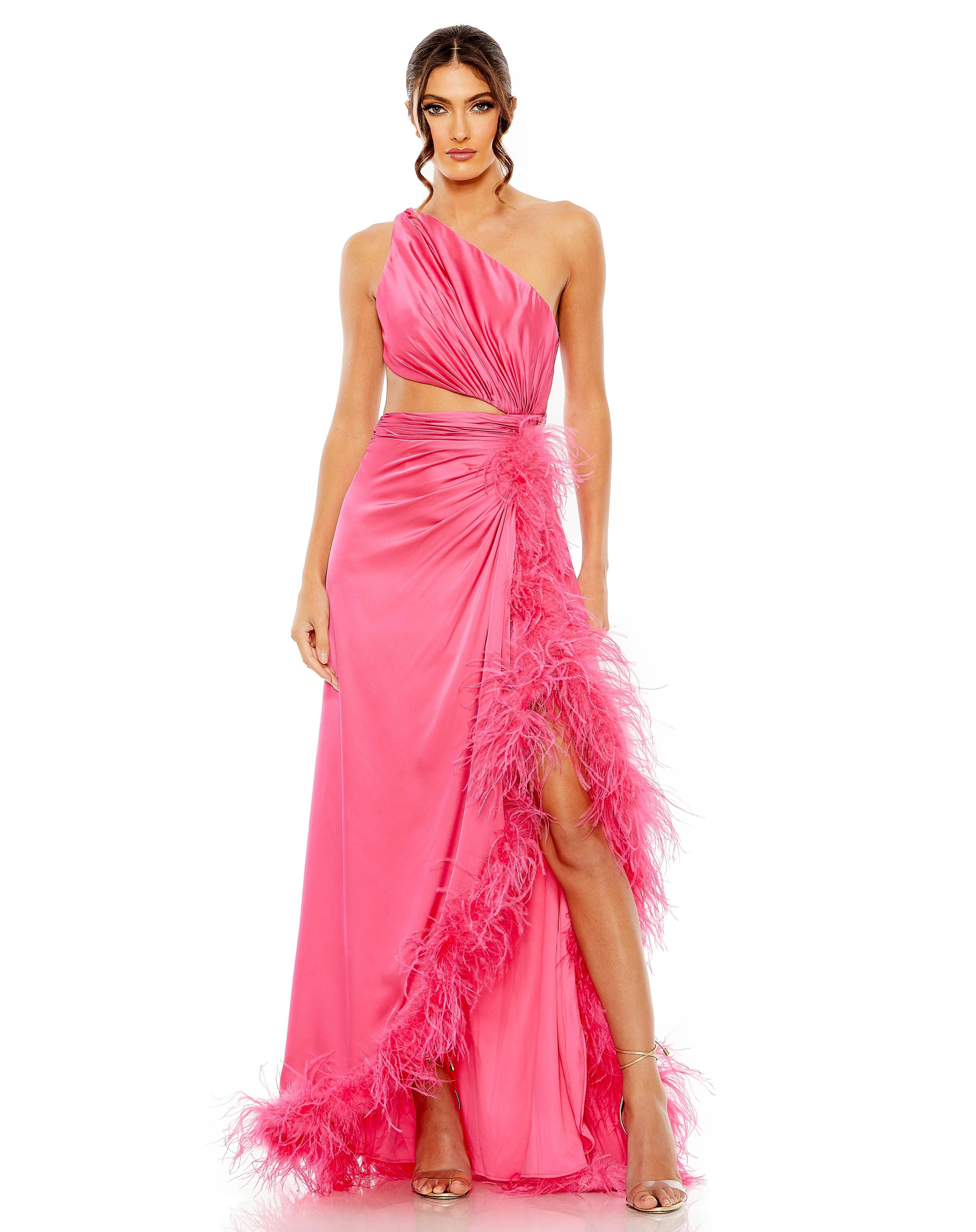 Just by looking at this Mac Duggal 11689 prom dress from The Dress Outlet, you can tell how classy it is. The bodice of this one-shoulder dress is ruched and has a side-to-back cutout. From the front slit to the hem, which ends in a brush train, ostrich feathers add style to this fit and flare prom dress. From homecoming to prom night, this dress will offer you a stunning appearance for the entire event!