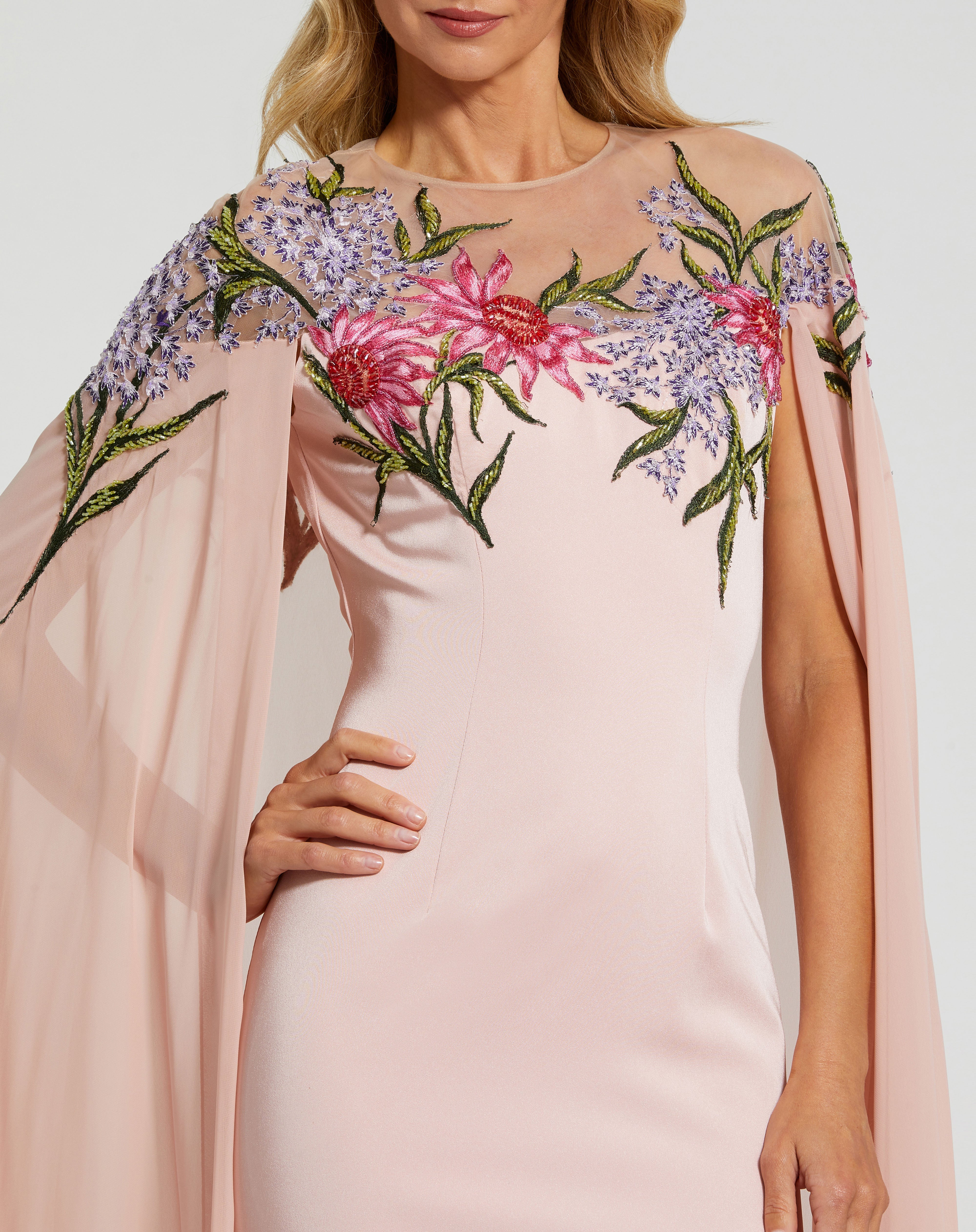 Step into the limelight in the opulent Mac Duggal 11798 masterpiece. Radiating timeless beauty with multicolored floral embroidery and sparkling jewel embellishments, this gown features an illusion top with a secure full back, button and zipper closure, and a jewel neckline. The attached long cape adds allure and grandeur to your entrance. The sheath silhouette of the skirt flows seamlessly to a sweeping train, making you feel like a goddess at any special occasion.
