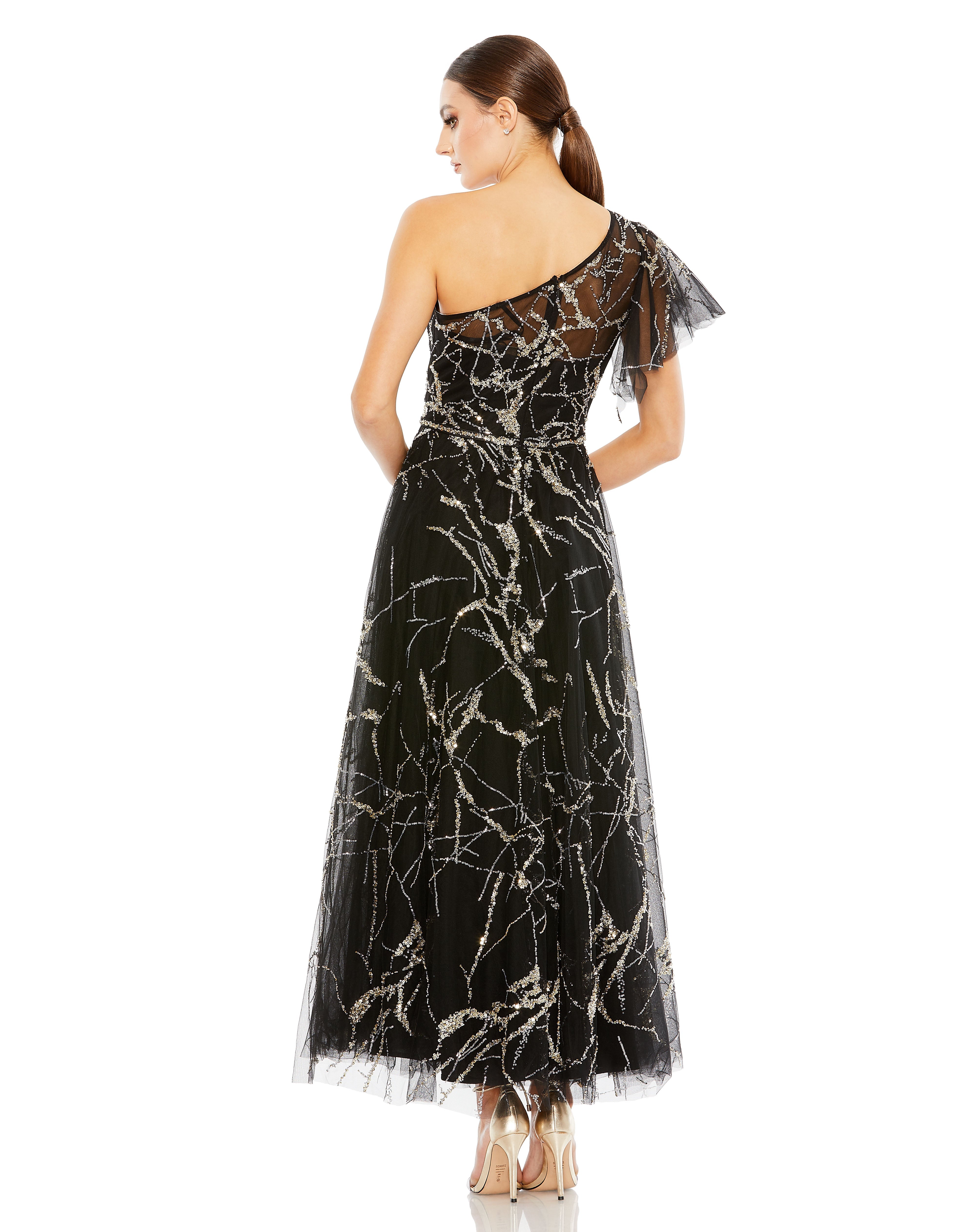 Flaunt your innate beauty in Mac Duggal 20427. This stylish dress features a stunning two-tone pattern and shimmering sequin embellishment. The illusion top presents an asymmetrical neckline with a sweetheart lining, adorned with single short butterfly sleeves. The mid-open back detail adds a touch of allure, complete with a zipper closure for comfort. A delicate waistband highlights your feminine curves, while the A-line skirt gracefully descends to a tea-length hem. Radiate glamour with this sizzling Mac Duggal 20427 dress.
