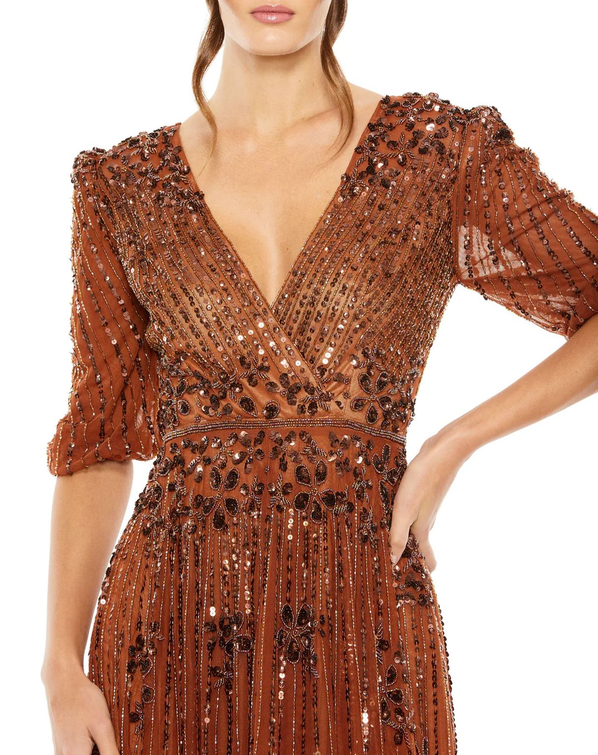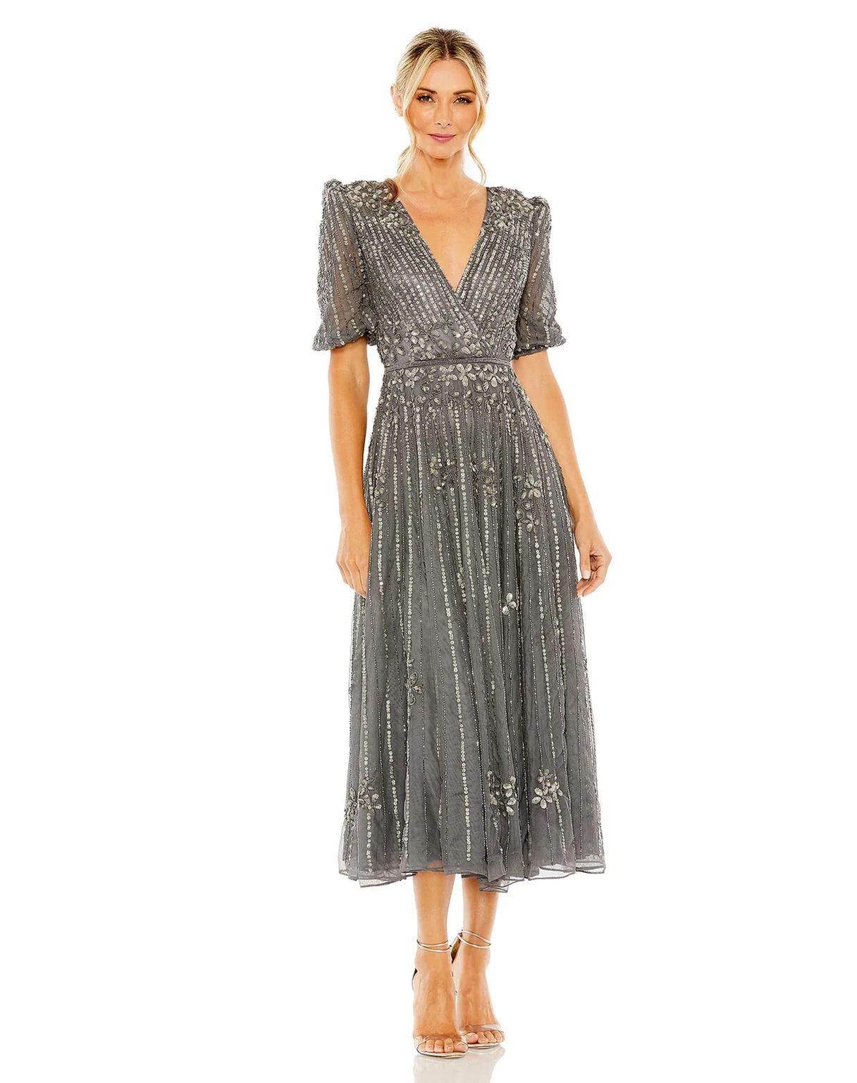 Mac Duggal 5995 Puff Quarter Length Sleeve V Neck Midi Dress