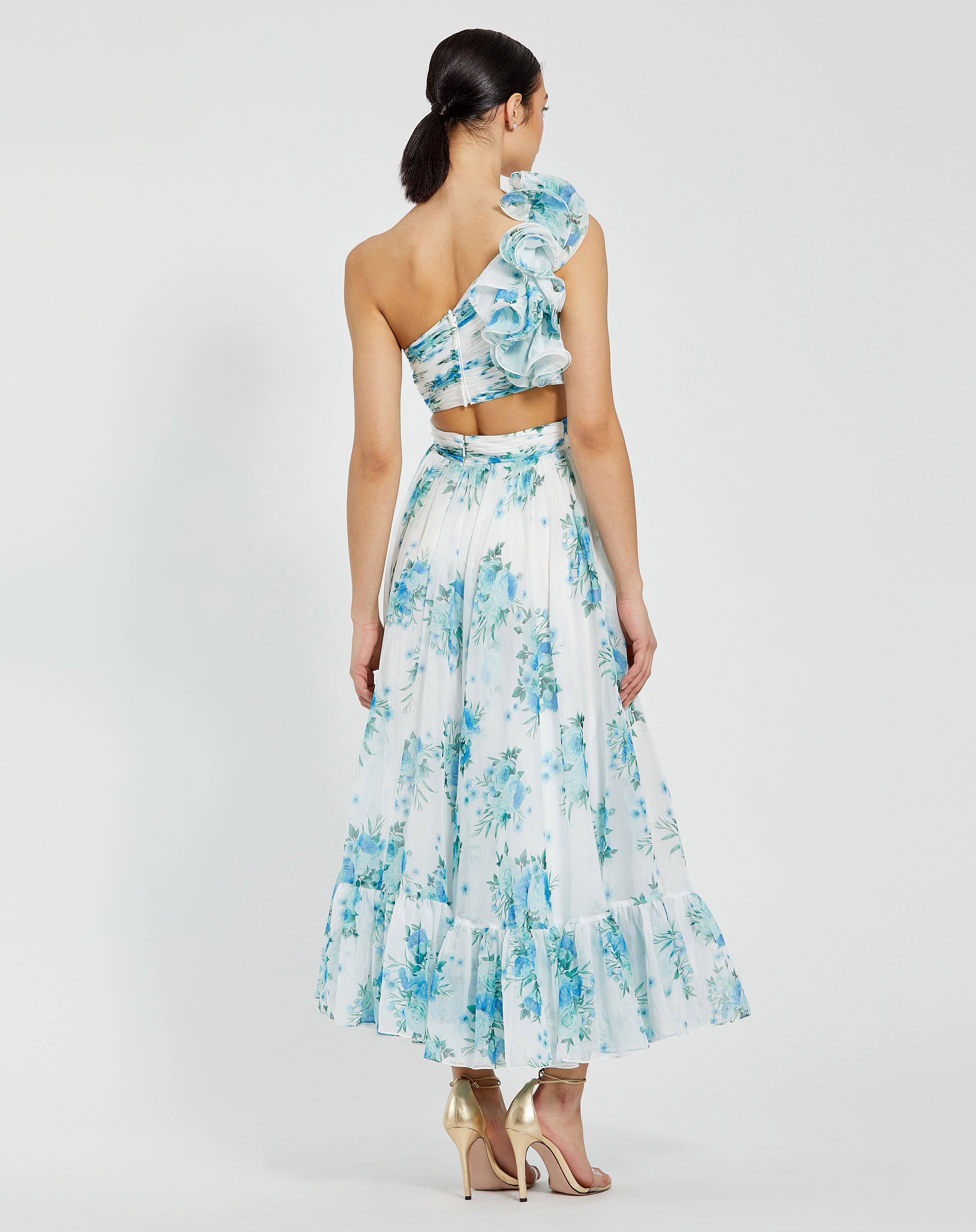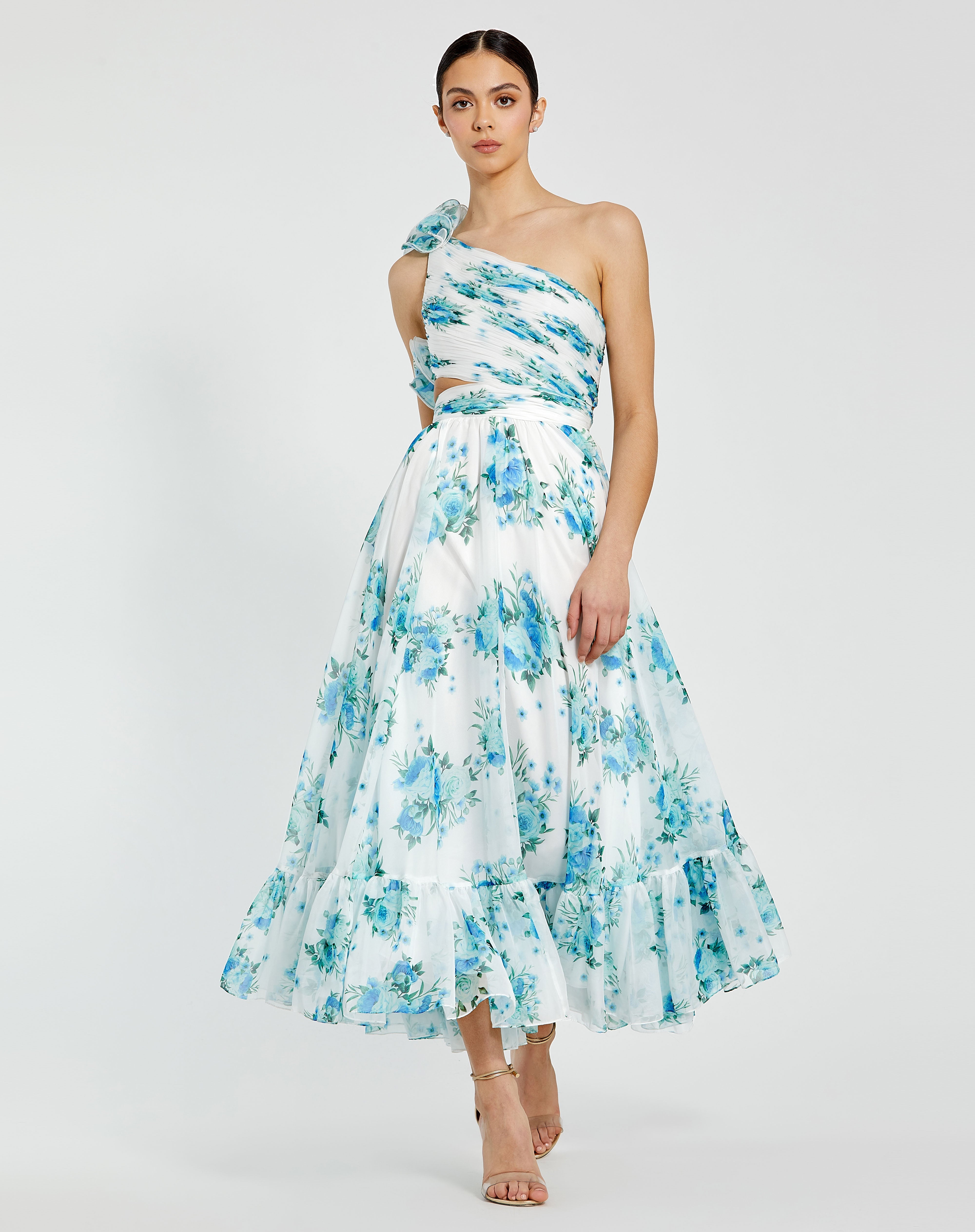 Adorn yourself in the exquisite Mac Duggal 68655—a chiffon masterpiece with a modern floral print for a romantic touch. The whimsical one-shoulder design creates an enchanting tone, complemented by a fitted bodice with ruching that accentuates the silhouette. The asymmetrical neckline adds allure, and a bold side cut-out with a modern edge extends to the back. Complete with an A-line tea-length skirt and back zipper closure, Mac Duggal 68655 is the perfect choice for those seeking a lovely and fashionable outfit for special occasions.