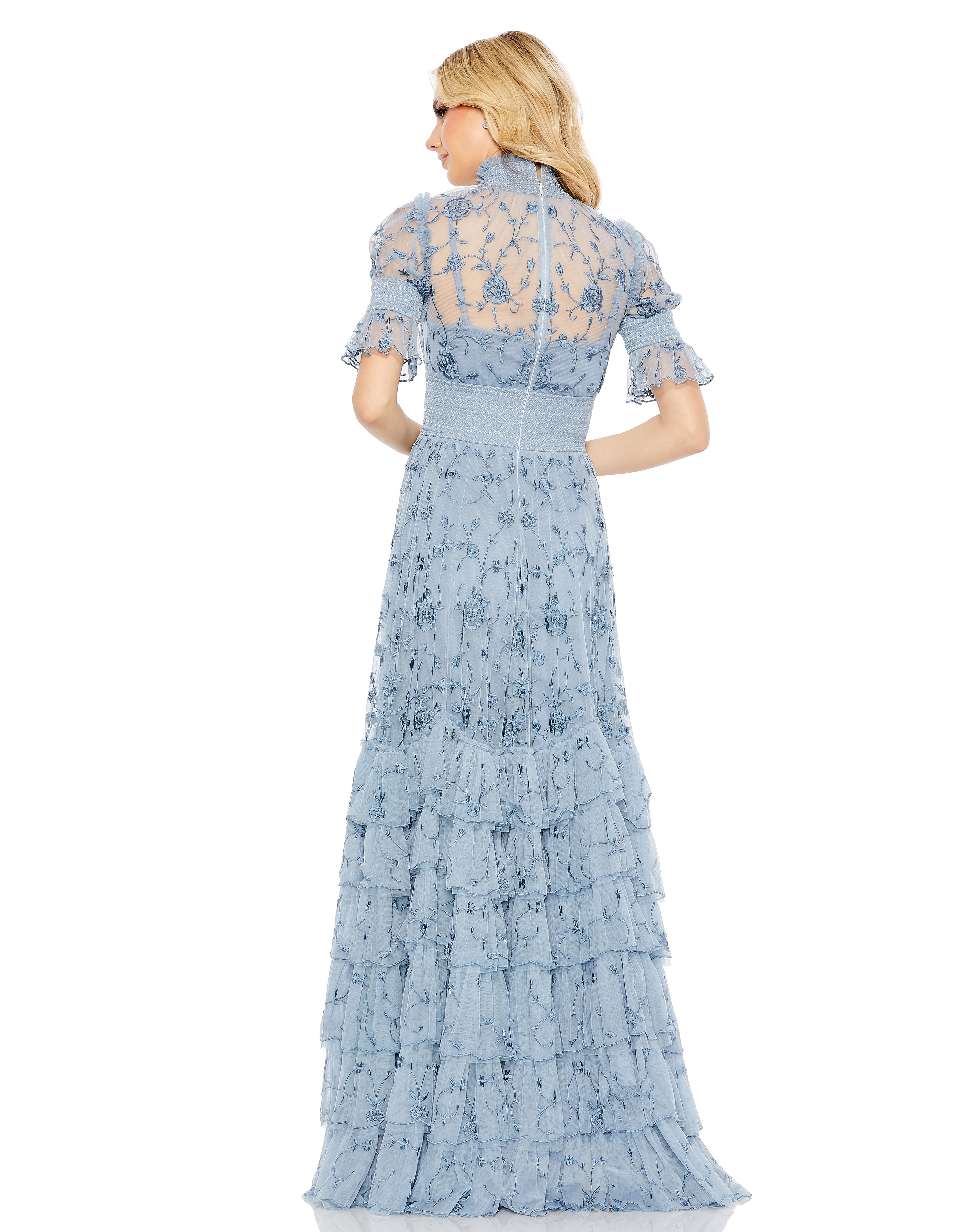 Capture a unique moment in Mac Duggal 8005. Adorned with floral embroidery, it's a romantic and eye-catching ensemble. Featuring a smocked high neckline, illusion sleeves, and empire waist, the A-line silhouette flows into a full-length skirt with ruffled tiers for graceful movement. The partial illusion back with a center zipper ensures a comfortably snug fit. Choose Mac Duggal 8005 for a stylishly spectacular look!