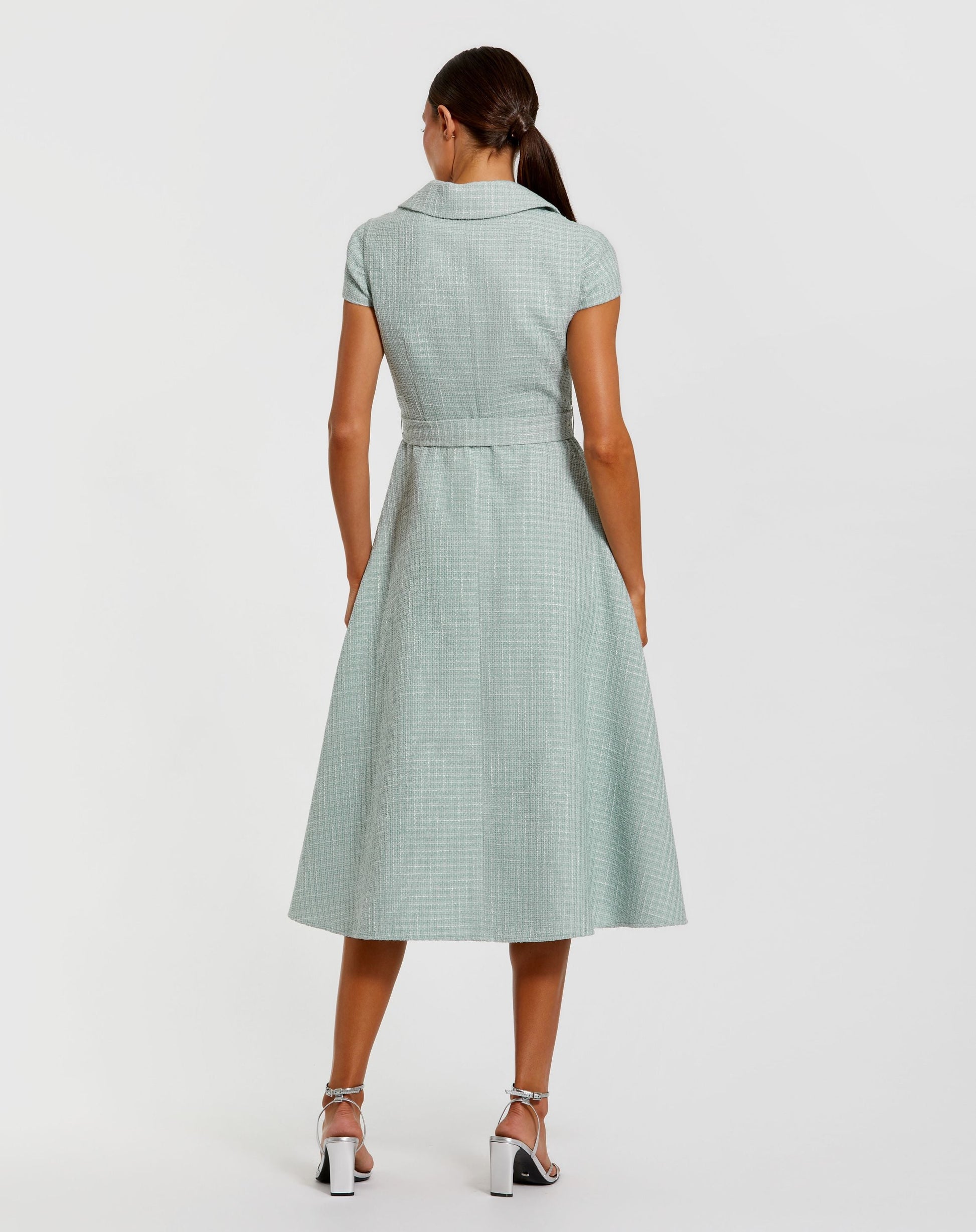 Timeless and tailored, the Mac Duggal 81199 is a chic boucle midi dress with a polished, feminine flair. Featuring a collared neckline, cap sleeves, and pearl button accents, this fully lined A-line dress flatters with a belted waist and structured silhouette. Front pockets add a touch of charm and function, while the concealed back zipper ensures a smooth fit. Perfect for daytime events, luncheons, or cocktail gatherings.