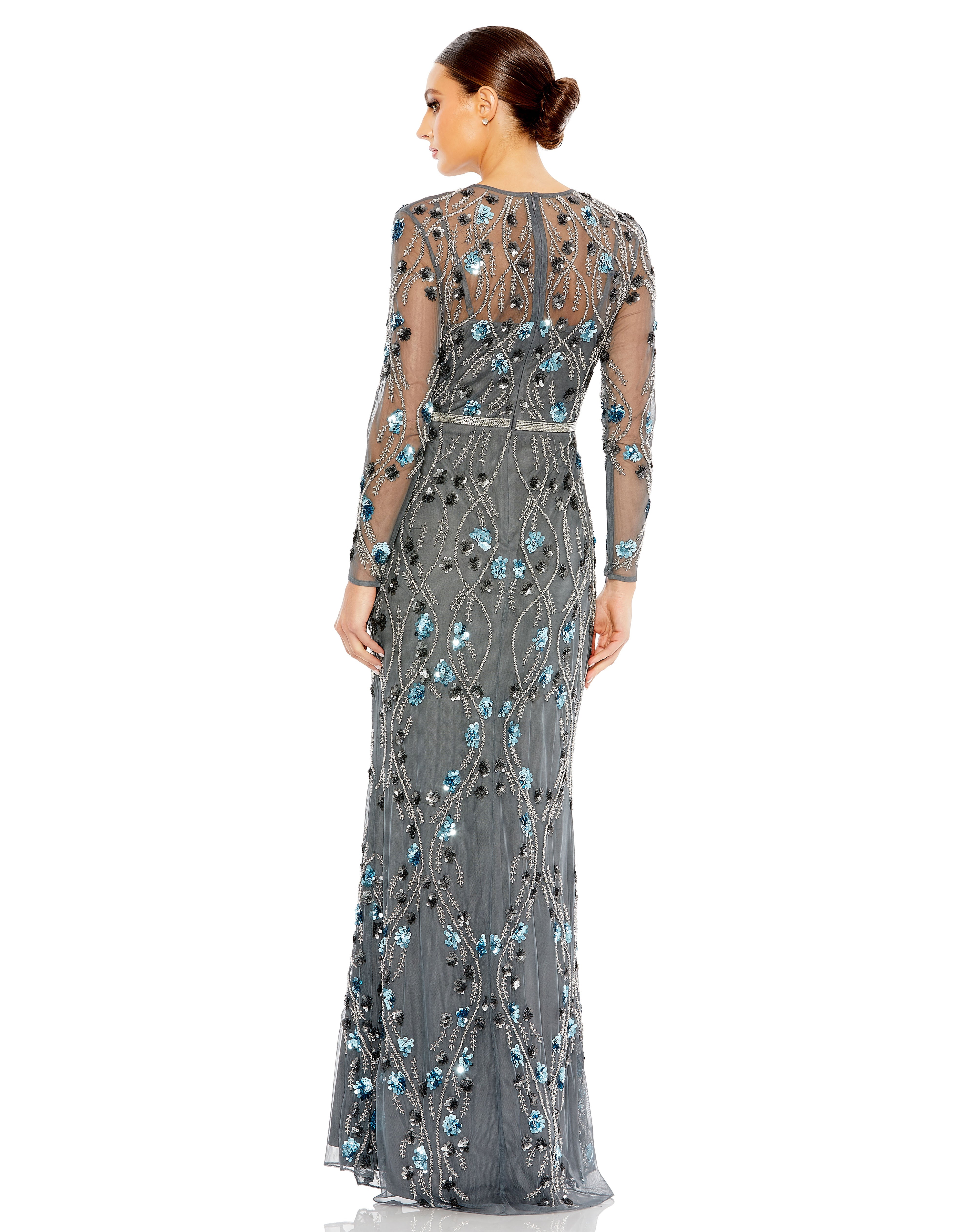 Make a stylish entrance in Mac Duggal 93772. The gown is adorned with captivating floral sequins and beads, casting a magical shimmer. Featuring an illusion jewel neckline, long sleeves, and a partial illusion full back with a zipper closure for a perfect fit. A bugle-beaded thin belt cinches the waist, enhancing your figure. The sheath skirt flows to a full-length hemline. Prepare to enchant the night in this Mac Duggal 93772 masterpiece.