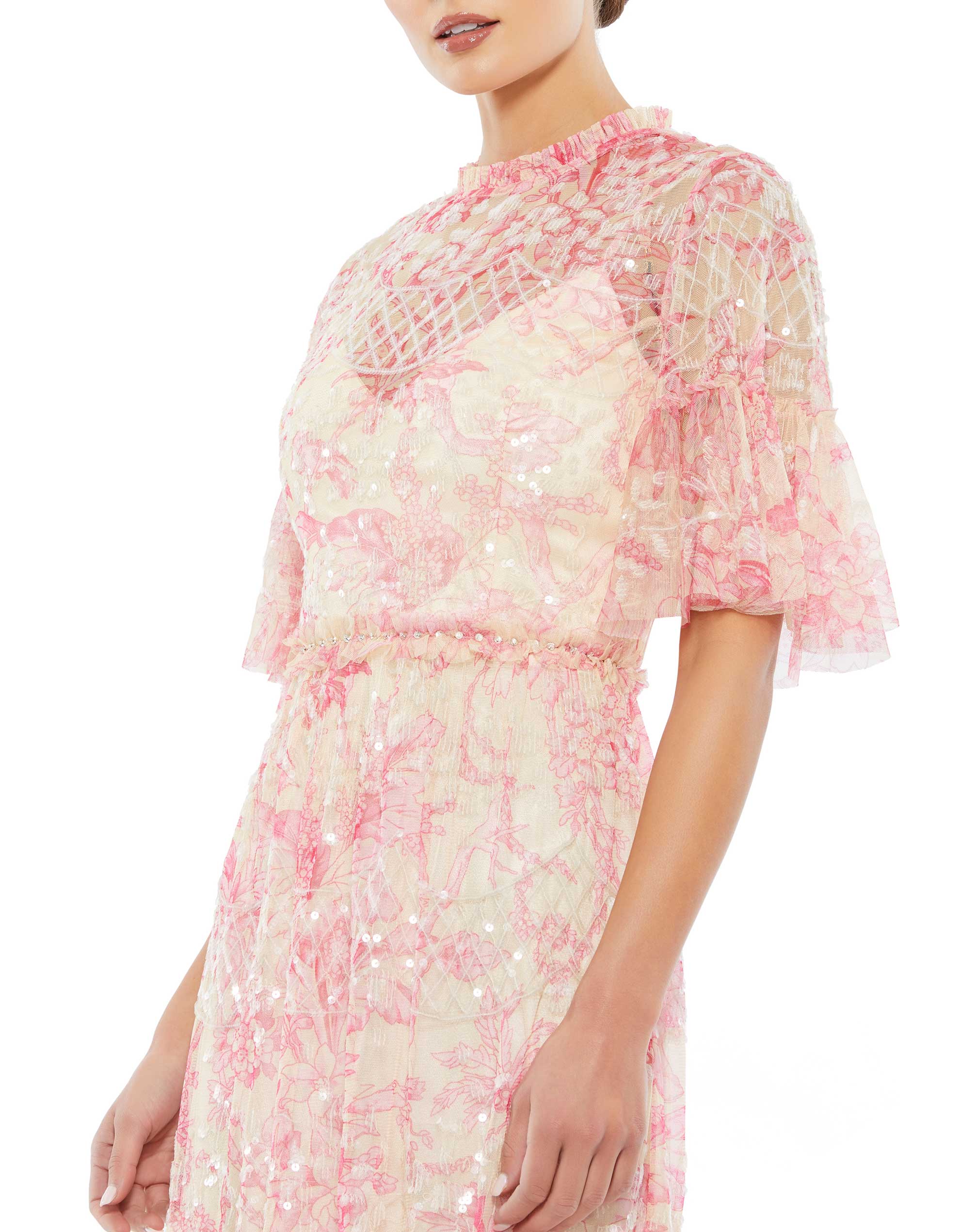 The Mac Duggal A9148 Short Floral Print Cocktail Dress will make a stylish statement with your cocktail wear. For parties, weddings, or any other special occasion where you want to look good, this enchanted dress is ideal. The vivid floral print lends a hint of romance and charm, and the short sleeve style and sheer fabric give off an airy, delicate vibe. Your form is accentuated by the fitted bodice and flared skirt, which create a stylish yet fun silhouette. This dress, which blends comfort and elegance with painstaking attention to detail, will make sure you look and feel amazing all night long.