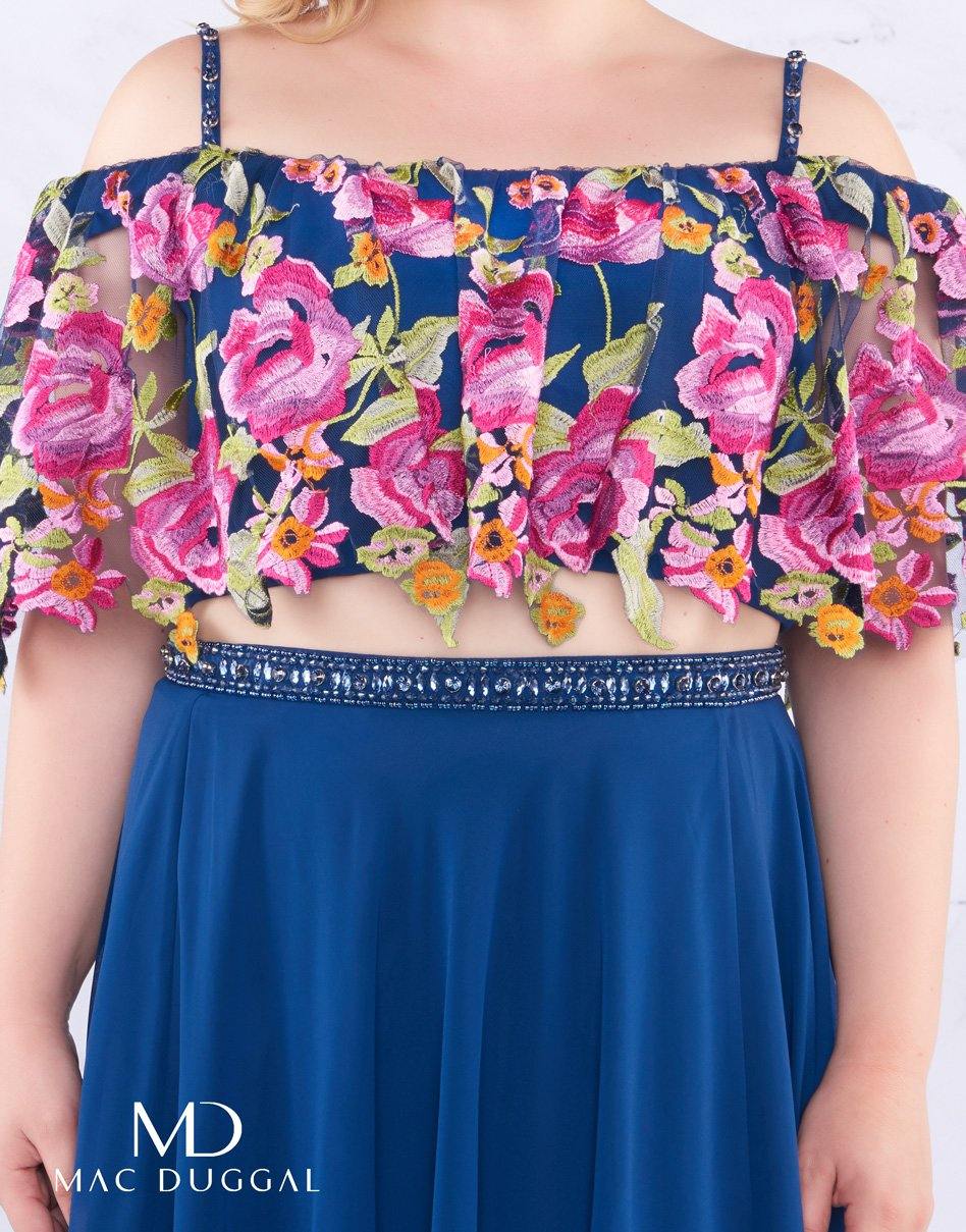 This stunning two piece off shoulder long dress features a floral neckline with a print. Jewelry adorns the straps and waist. The skirt opens in an A-line silhouette with a catchy upper slit and a train. Perfect for any special occasion.
