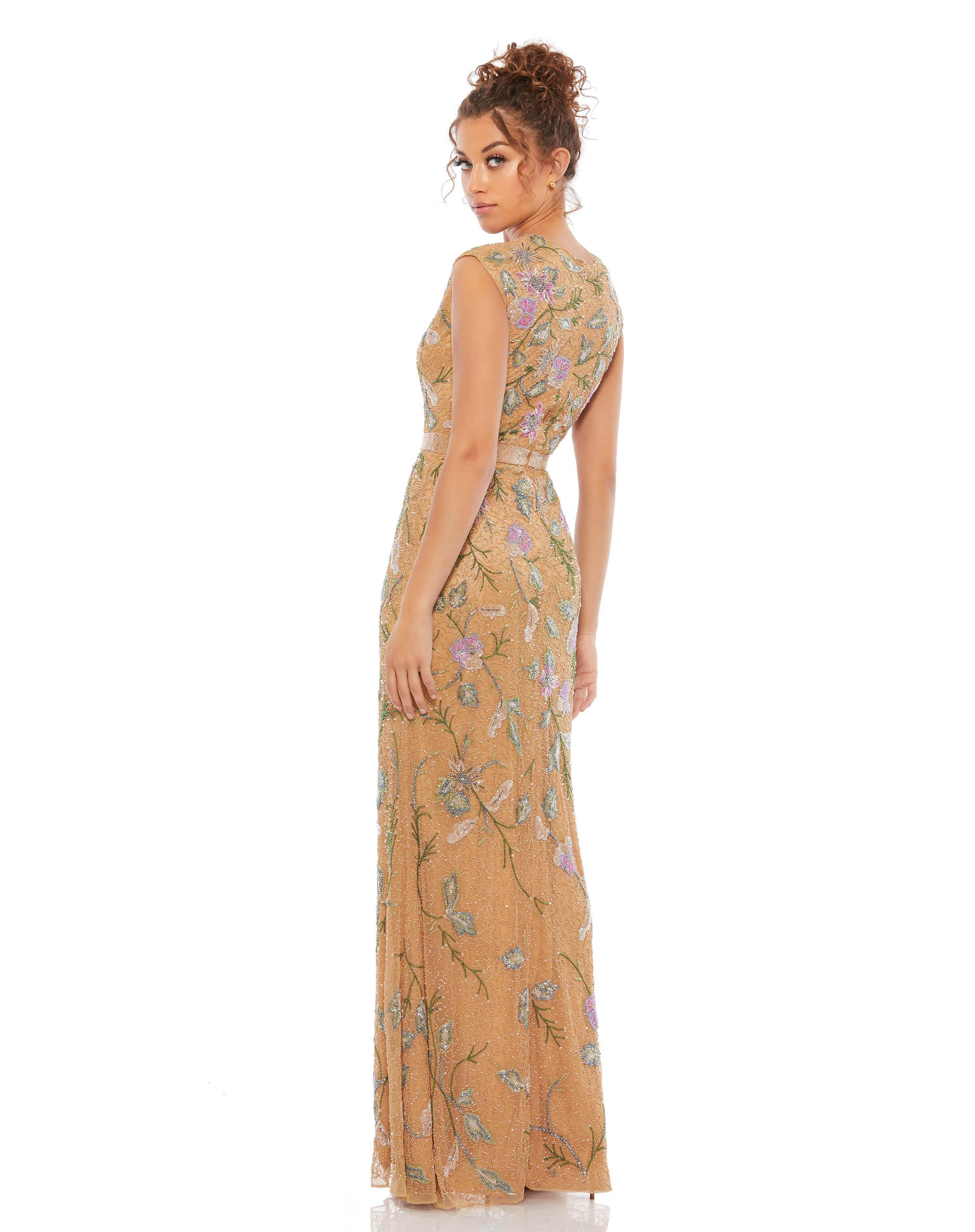 This stunning long cap sleeve gown is decorated with colorful ornaments and has a brick neckline. A beaded waistband accents this dress and ends with a sweep train.