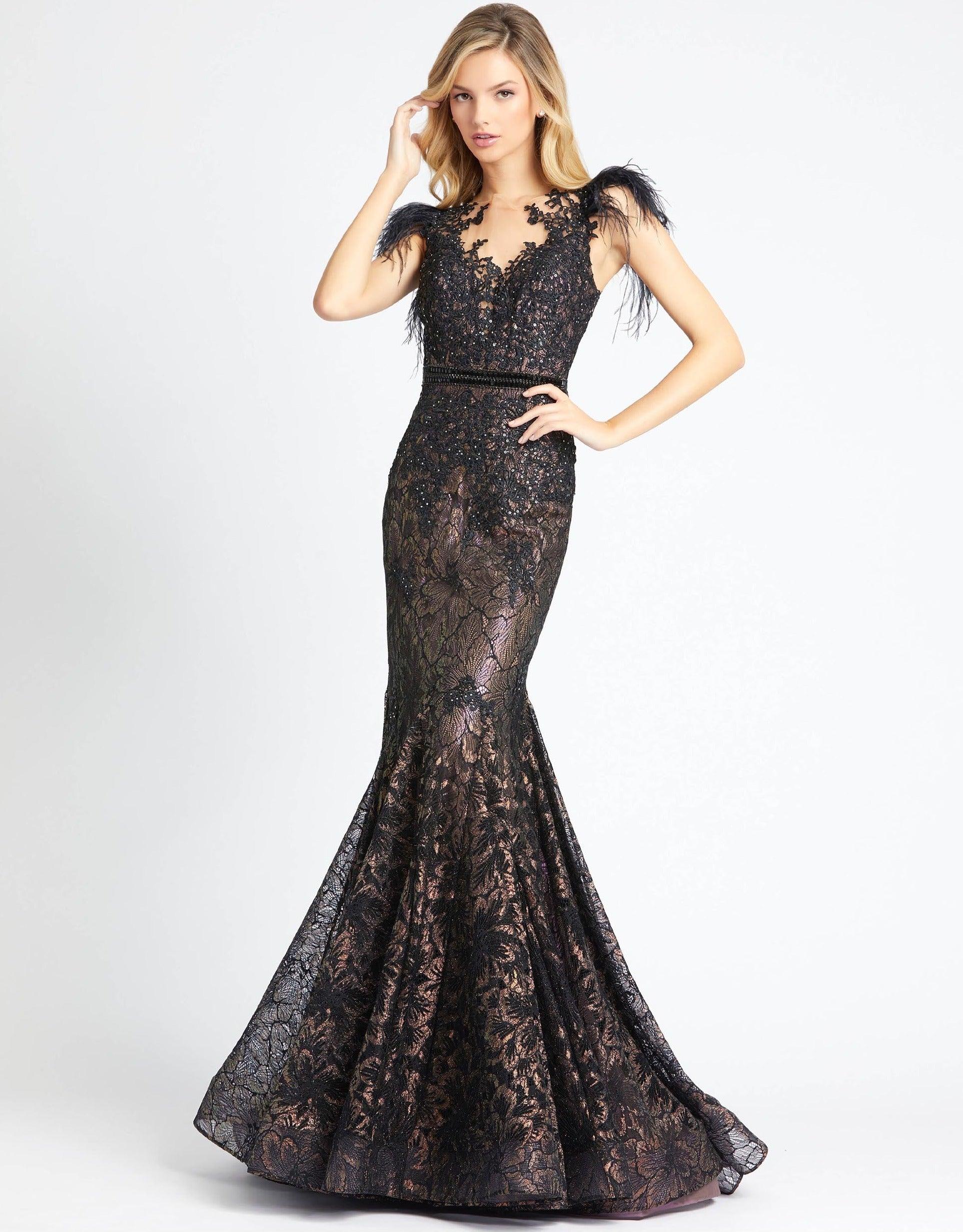 We have the perfect prom dress for you! This elegant prom dress makes a splash on the sidelines of formal events with its classic color and timeless elegance. Tailored to be universally flattering ,it has an illusion bateau neckline crowns the fitted bodice with feathers delicately hand sewn on the outer banks of the cap sleeves. This dress is style in iridescent nude lining with black lace, fused with diamante jet black stones and matching belt. The back offers a sheer full panel with a fabulous sweep train for that perfect finish. This stylish, versatile dress is just what you need.