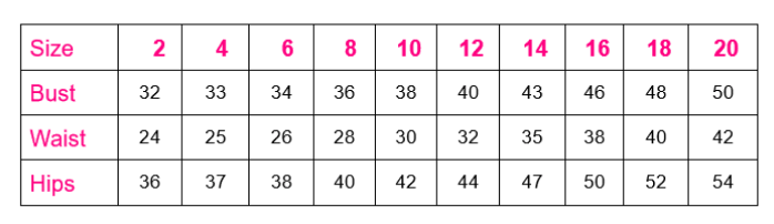 Sizes : 0, 2, 4, 6, 8, 10