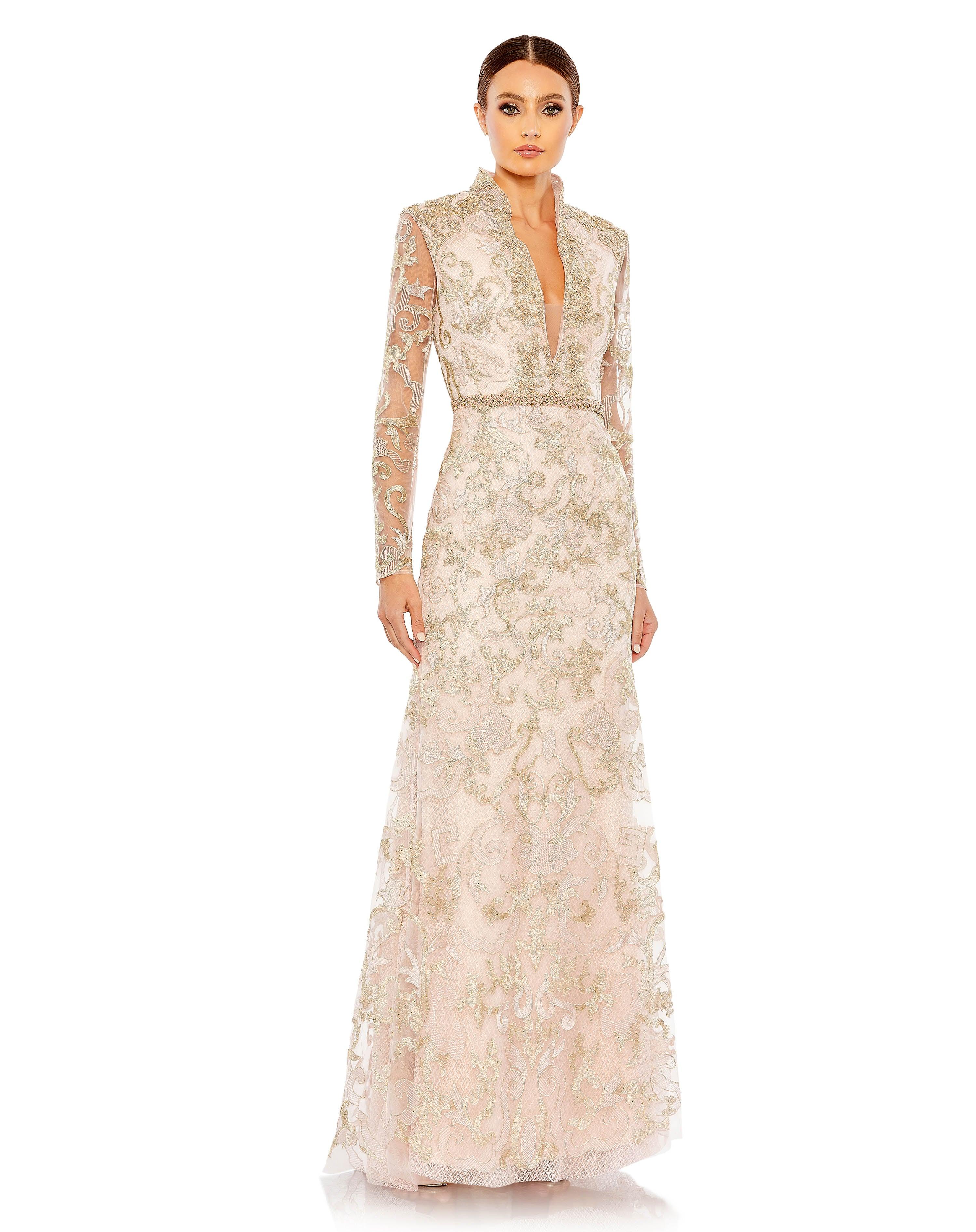 This beaded dress features a high collar and a deep V-neckline with long sleeves.  This gown adorned with pearls at the waist  and the trumpet skirt shines onto the floor.