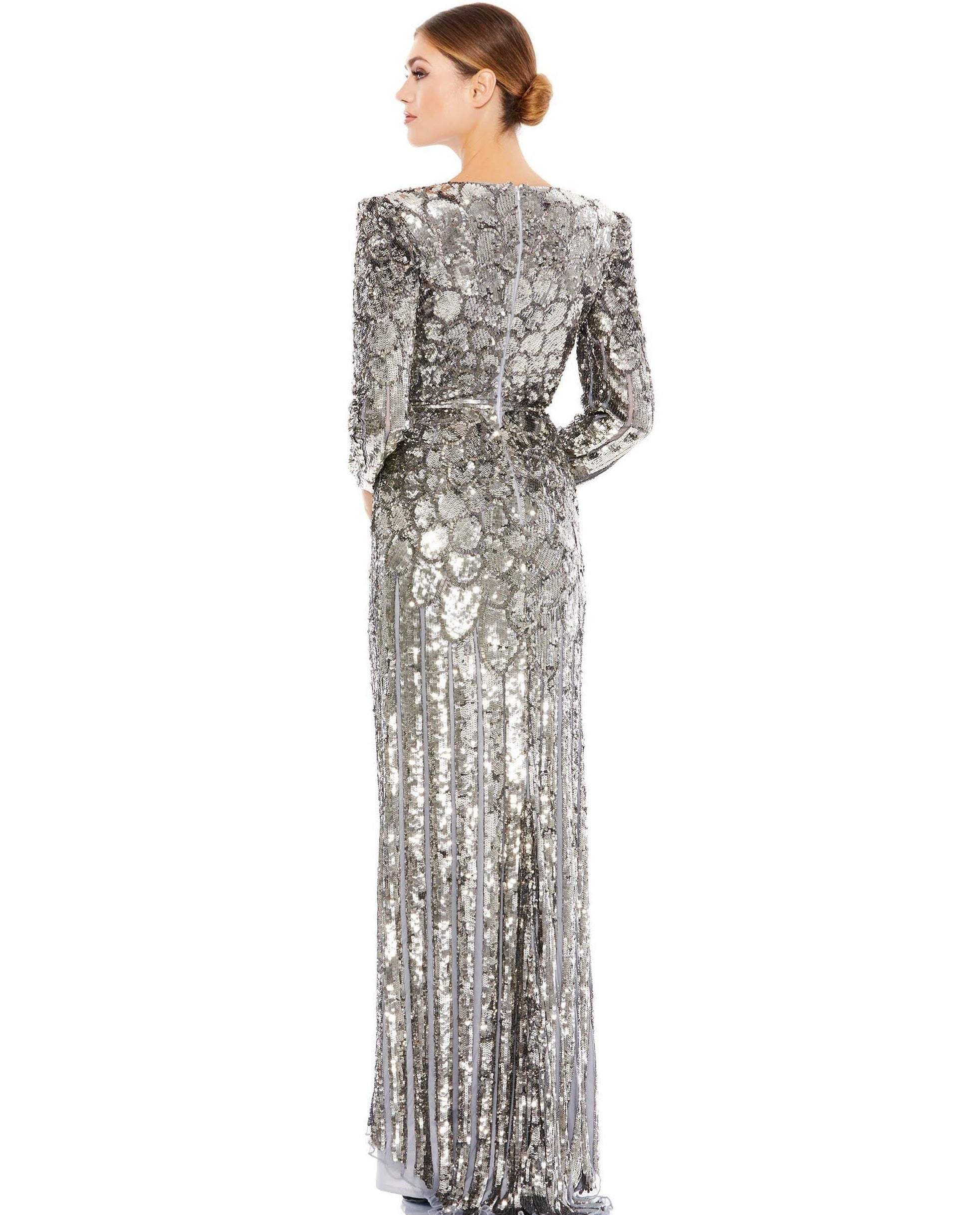 This elegant long gown for the mother of the bride features a sleek silhouette made of intricately patterned sequins embellished with a V-neckline and long sleeves with a hip high center slit and a brushed train.