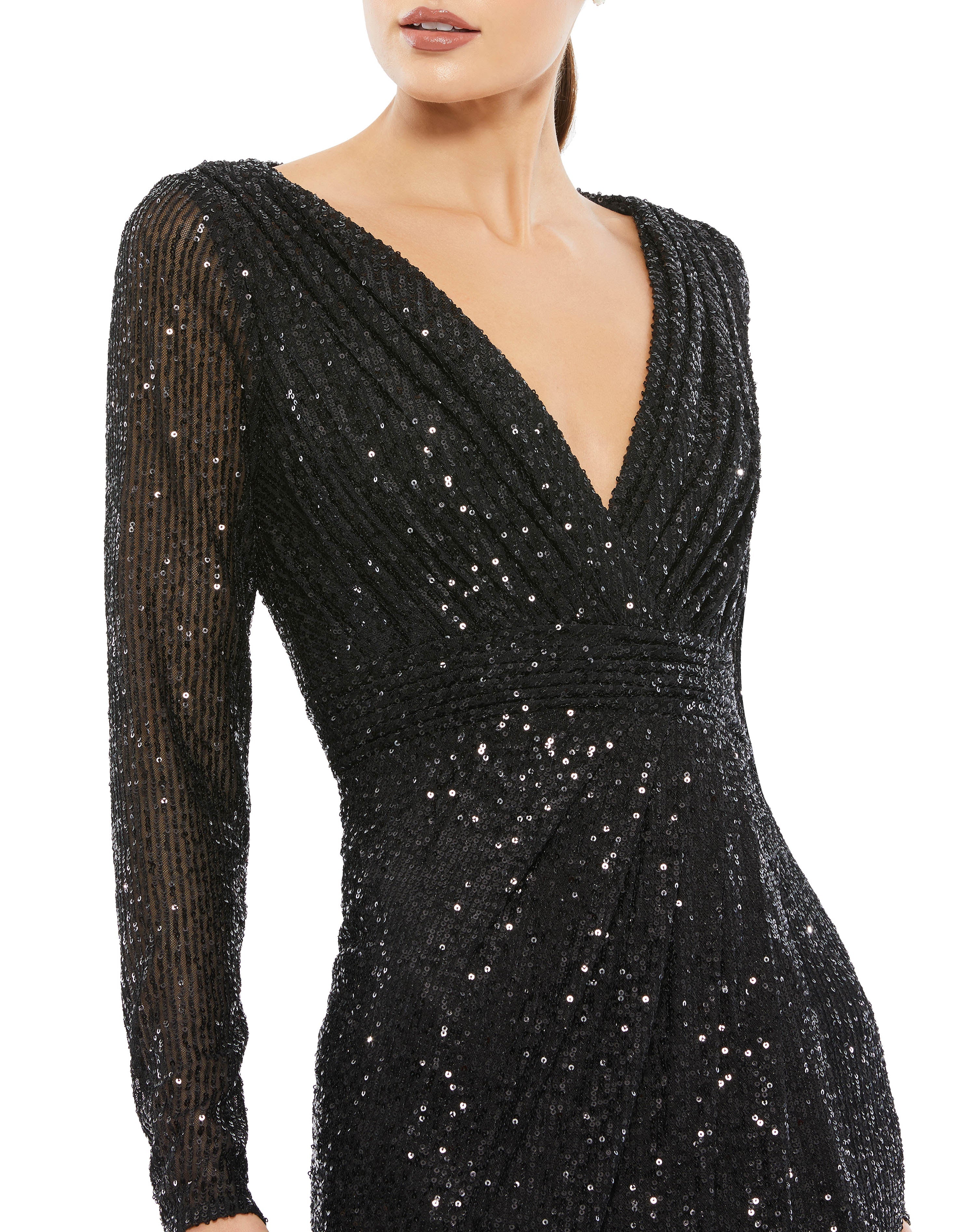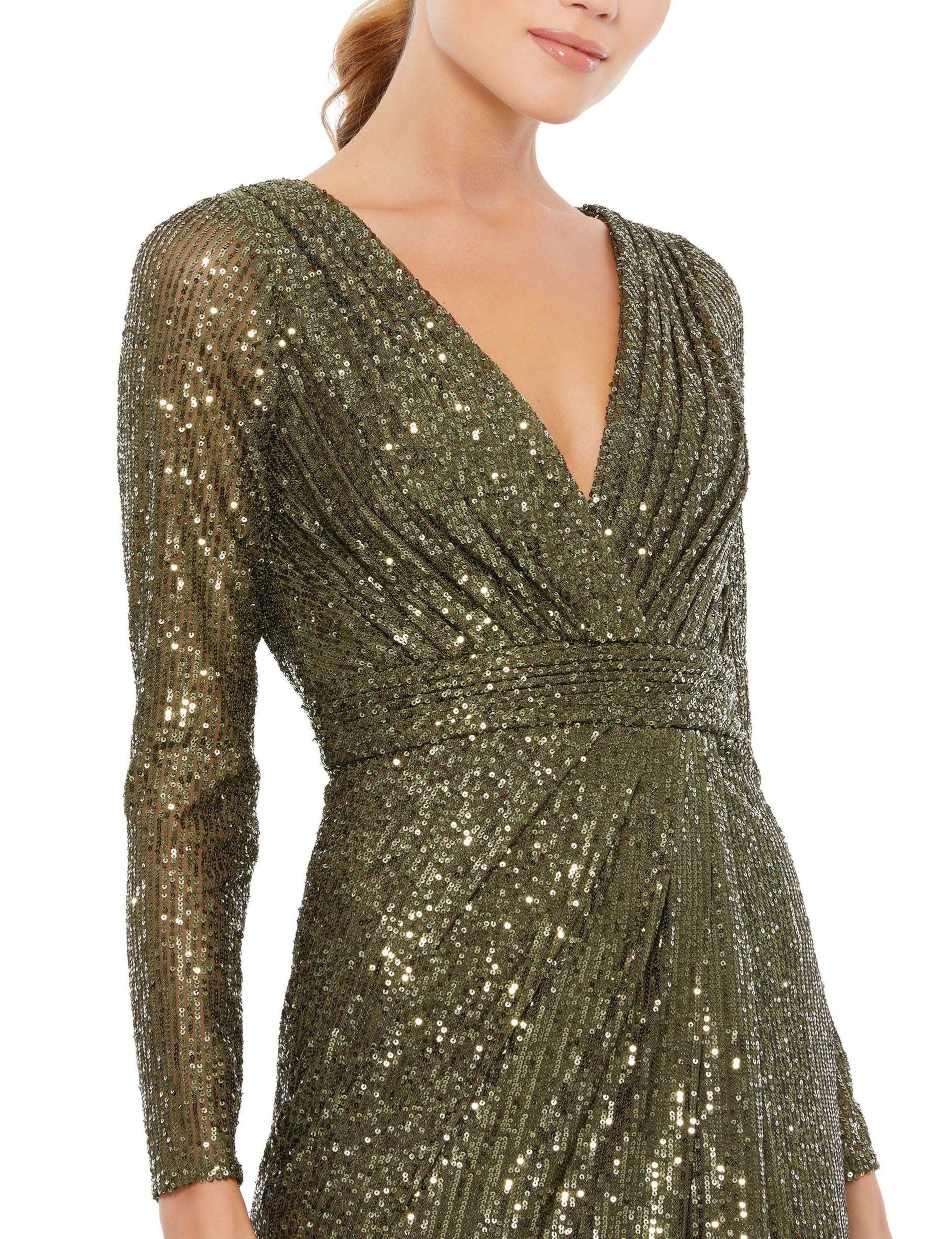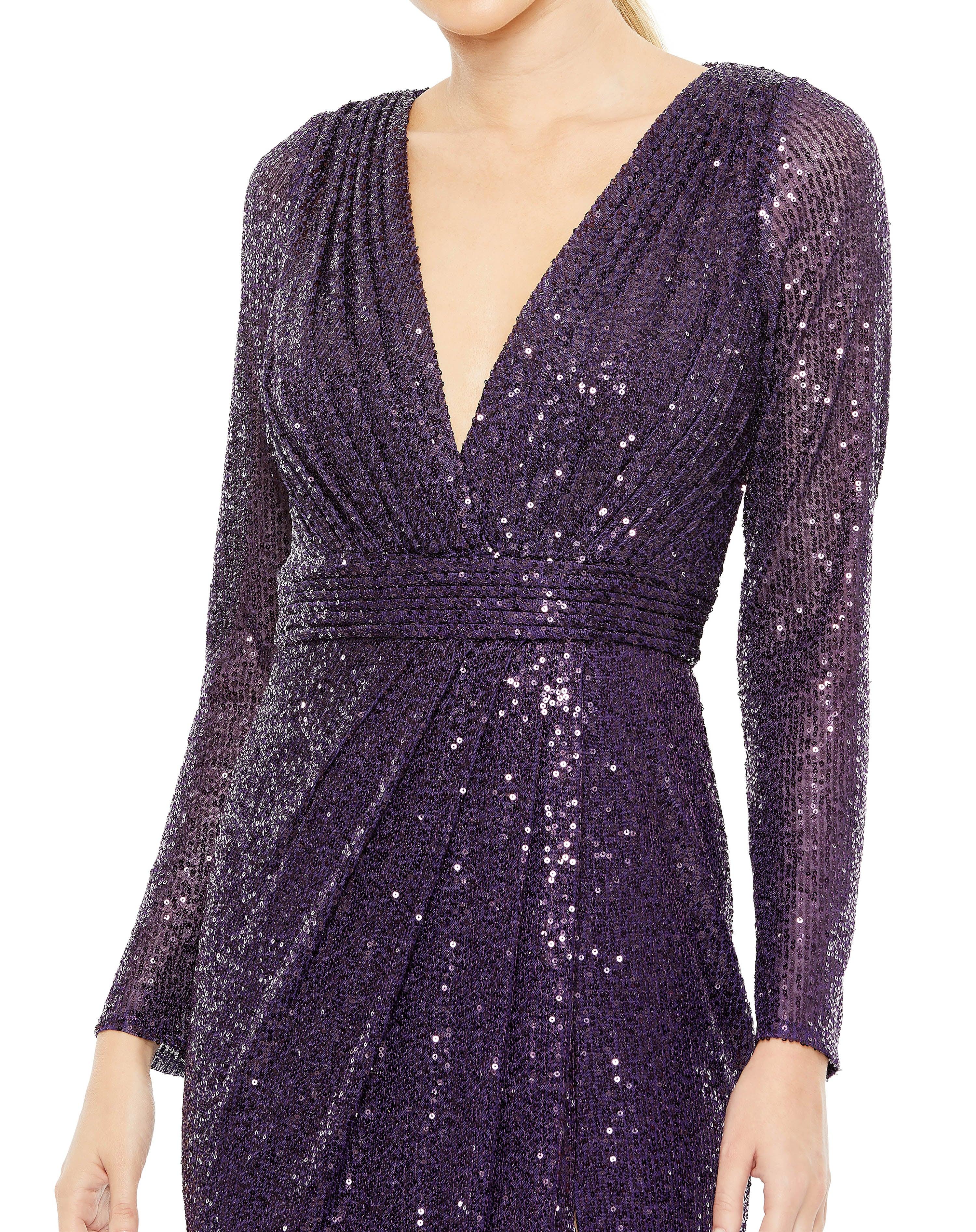 Get ready to turn heads at your next formal event with this exquisite Mac Duggal dress. Its simplicity and elegance are a winning combination. Picture yourself in this stunning long sleeve gown, showcasing a captivating deep V-neckline and a flattering full back. The alluring high slit adds a hint of allure while seamlessly merging with the graceful train. Crafted from a luxuriously soft fabric, this dress exudes sophistication and adds a touch of glamour to any ensemble. Choose from a range of colors, each boasting intricate detailing that amplifies its irresistible charm. Embrace this timeless and classy piece, perfect for a night out on the town or a glamorous black-tie affair. You'll find yourself reaching for it again and again.