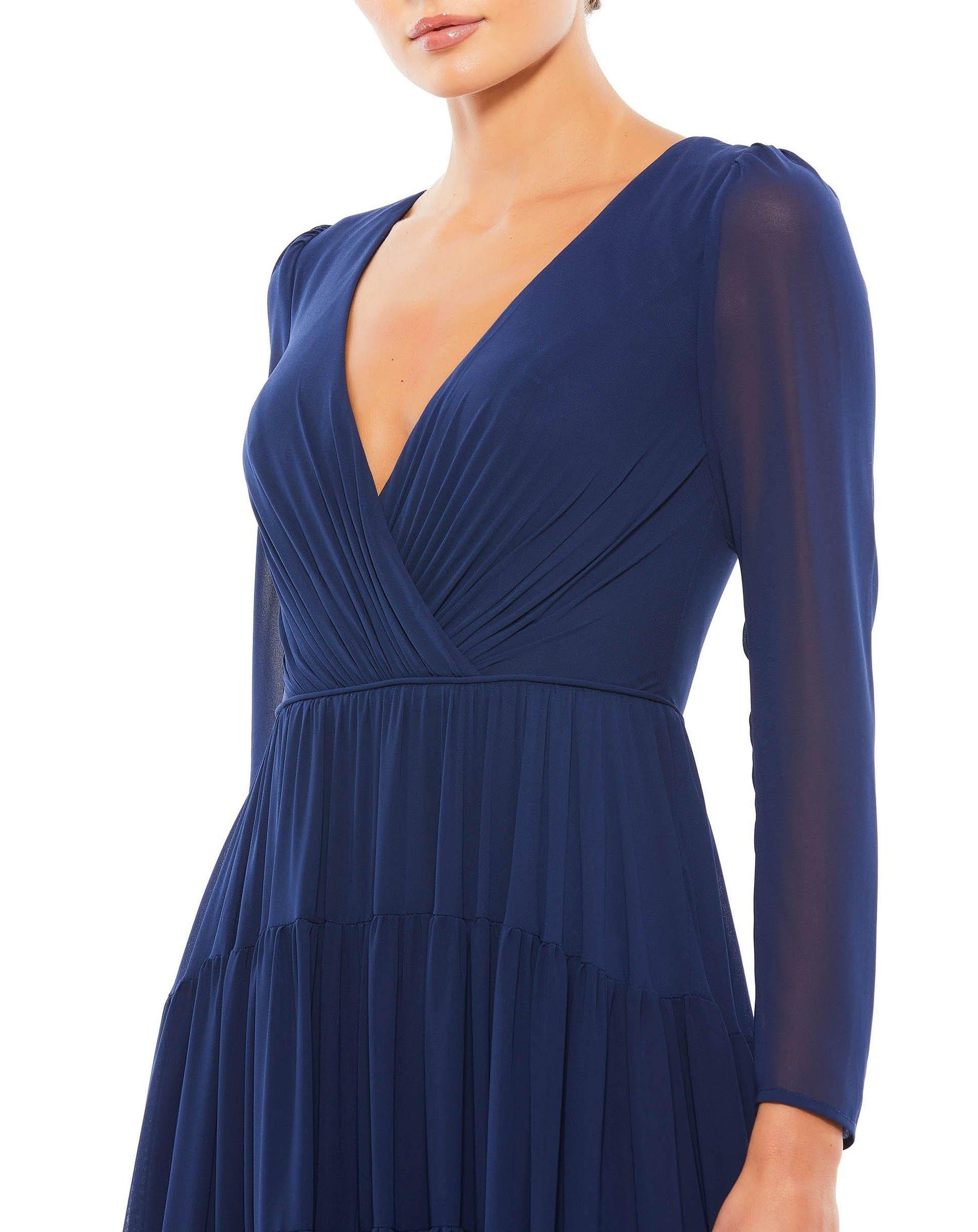 Elegant long formal dress with long sleeves paired with a deep V-neckline. The skirt is two tier and is torn and has a continuous cut. an A-line silhouette and of chiffon fabric.