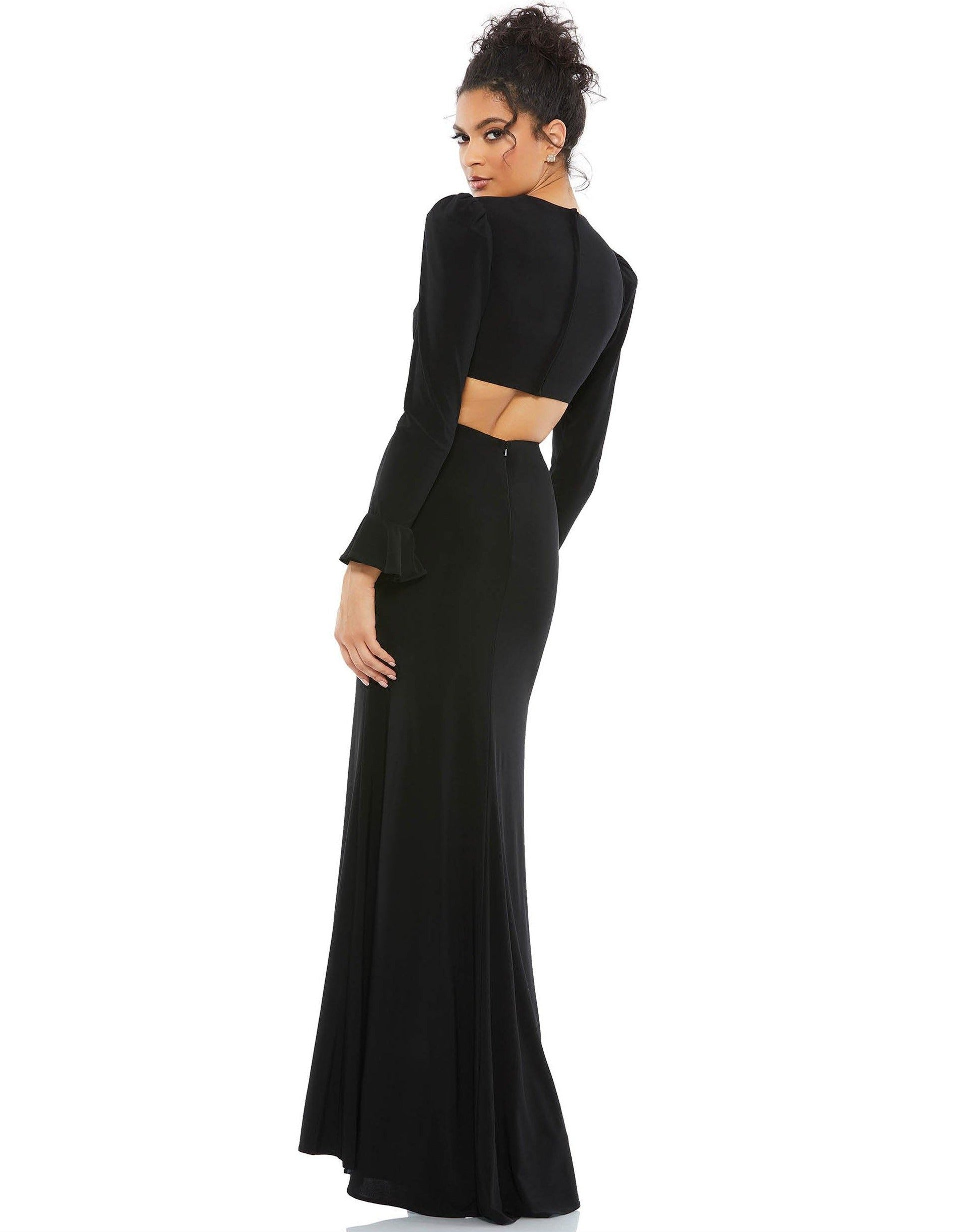 This stunning sexy formal gown with a sleek silhouette and long sleeve embellishment with a daring waist to lower back cutout.