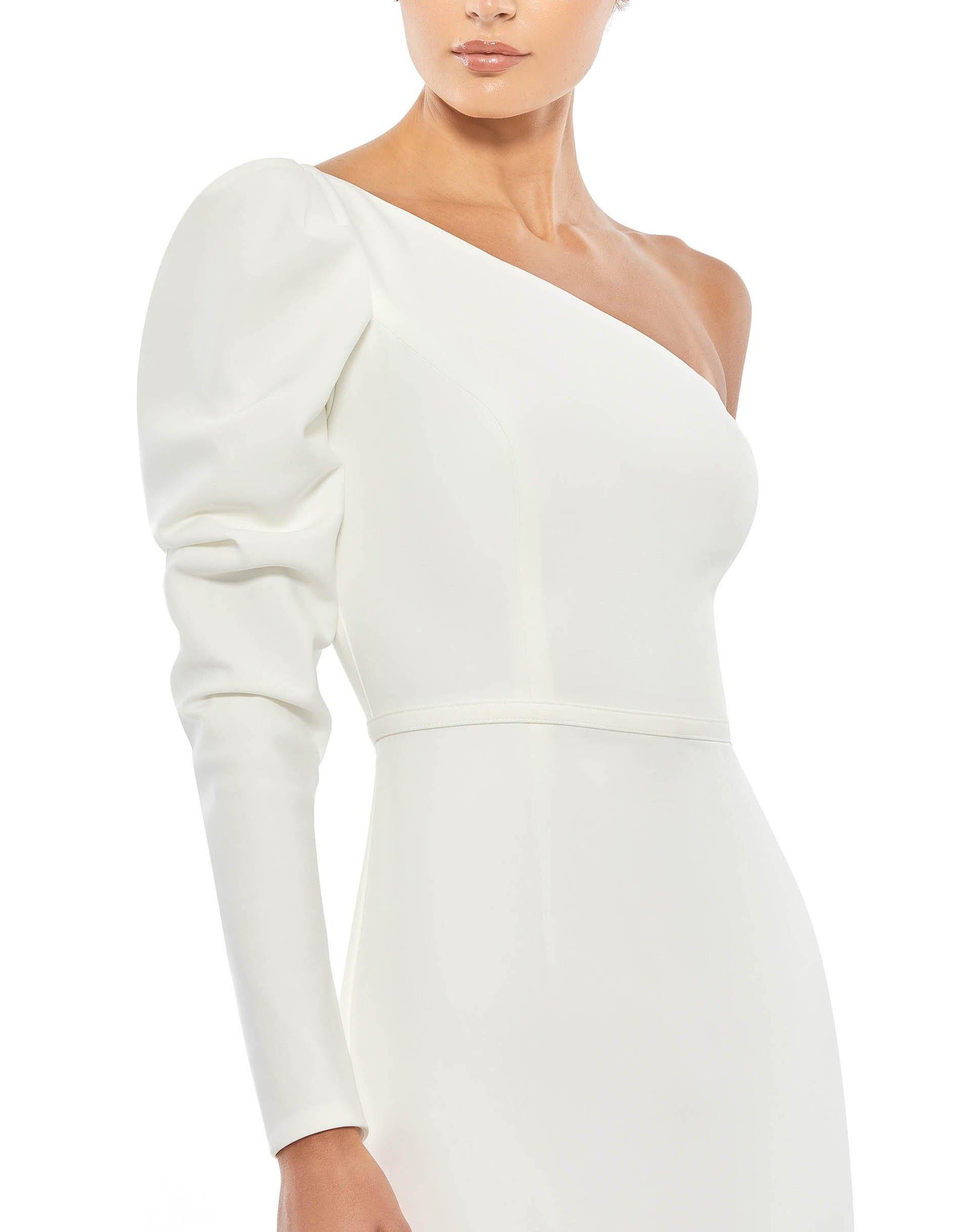Elegant long dress features puff accented long sleeves and a one shoulder neckline. A thin set on waistband accents and finished off with a sweep train.