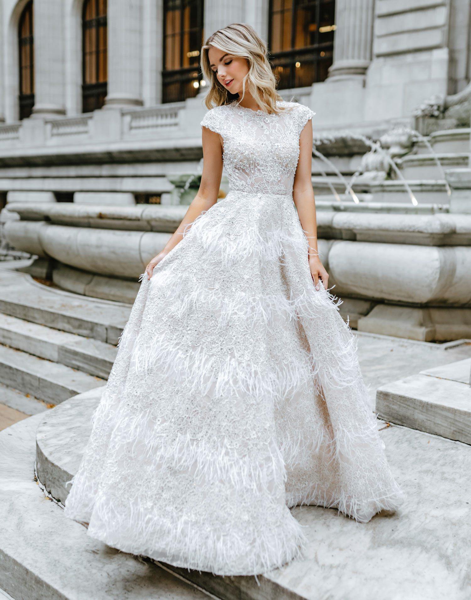 This stunning long dress features a cap sleeve with jewel neckline. This embroidered dress is accented with fur details and the skirt is embellished with a ball gown with a ready made train.