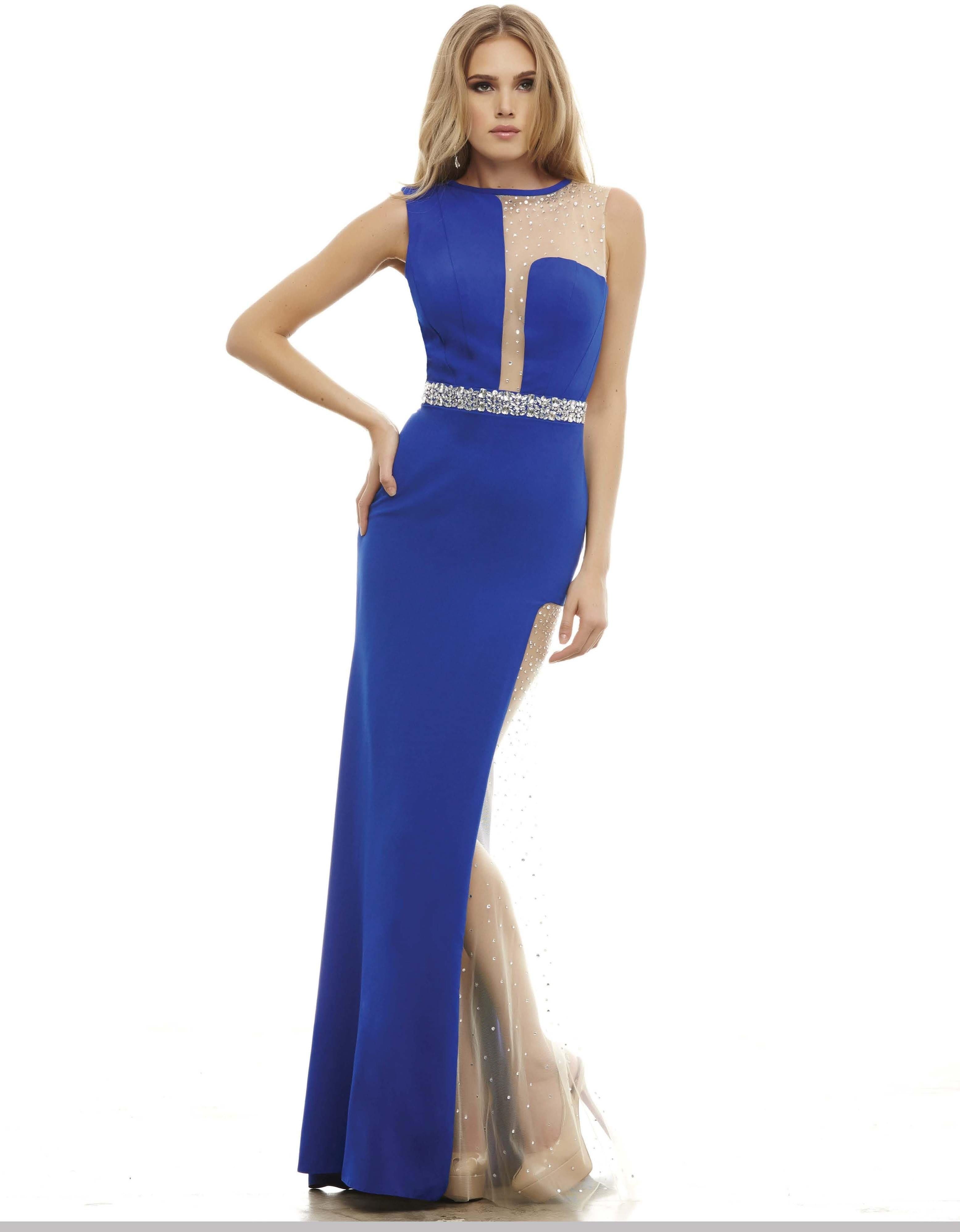 This stunning long evening gown features sleeves with back cutout and embellishments at the waist. Perfect for any special occasion.